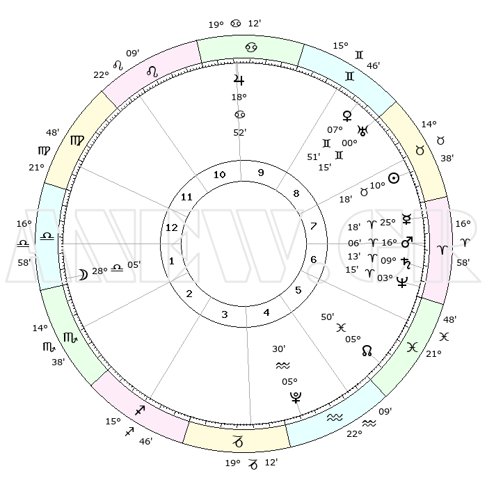 | | ΘΕΣΕΙΣ ΠΛΑΝΗΤΩΝ ΑΣΤΡΟΛΟΓΙΚΟΥ ΧΑΡΤΗ ΤΗΣ ΣΤΙΓΜΗΣ ΑΥΤΗΣ | | | | Πλανήτης | Ζώδιο | Μοίρες | Δεκαήμ. | Σε οίκο | Απόκλιση | | Ακμές των οίκων | | Ηλιος | Ταύρος | 10°14' | Δεύτερο | 8 | 14 N 53 | | 1ος | 28°09' | Παρθένος | | Σελήνη | Ζυγός | 27°18' | Τρίτο | 2 | 14 S 08 | | 2ος | 24°36' | Ζυγός | | Ερμής | Κριός | 25°11' | Τρίτο | 8 | 07 N 55 | | 3ος | 24°57' | Σκορπιός | | Αφροδίτη | Δίδυμοι | 07°47' | Πρώτο | 9 | 22 N 28 | | 4ος | 27°55' | Τοξότης | | Αρης | Κριός | 16°03' | Δεύτερο | 7 | 05 N 30 | | 5ος | 00°55' | Υδροχόος | | Δίας | Καρκίνος | 18°51' | Δεύτερο | 10 | 22 N 30 | | 6ος | 01°25' | Ιχθείς | | Κρόνος | Κριός | 09°13' | Πρώτο | 7 | 01 N 39 | | 7ος | 28°09' | Ιχθείς | | Ουρανός | Δίδυμοι | 00°15' | Πρώτο | 9 | 20 N 02 | | 8ος | 24°36' | Κριός | | Ποσειδώνας | Κριός | 03°15' | Πρώτο | 7 | 00 N 05 | | 9ος | 24°57' | Ταύρος | | Πλούτωνας | Υδροχόος | 05°30' | Πρώτο | 5 | 22 S 49 | | 10ος | 27°55' | Δίδυμοι | | Β. Δεσμός | Ιχθείς | 05°50' | Πρώτο | 6 | 09 S 22 | | 11ος | 00°55' | Λέων | | Ωροσκόπος | Παρθένος | 28°09' | Τρίτο | | | 12ος | 01°25' | Παρθένος | | Μεσουράνημα | Δίδυμοι | 27°55' | Τρίτο | | | |
