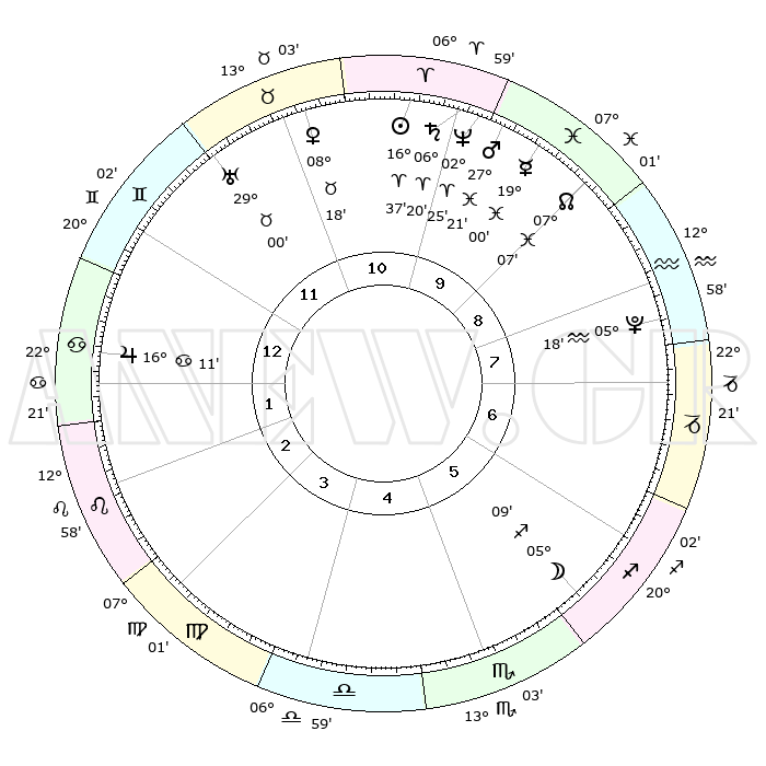 | | ΘΕΣΕΙΣ ΠΛΑΝΗΤΩΝ ΑΣΤΡΟΛΟΓΙΚΟΥ ΧΑΡΤΗ ΤΗΣ ΣΤΙΓΜΗΣ ΑΥΤΗΣ | | | | Πλανήτης | Ζώδιο | Μοίρες | Δεκαήμ. | Σε οίκο | Απόκλιση | | Ακμές των οίκων | | Ηλιος | Κριός | 16°33' | Δεύτερο | 11 | 06 N 30 | | 1ος | 00°32' | Καρκίνος | | Σελήνη | Τοξότης | 04°19' | Πρώτο | 6 | 26 S 04 | | 2ος | 21°18' | Καρκίνος | | Ερμής | Ιχθείς | 18°56' | Δεύτερο | 10 | 06 S 14 | | 3ος | 13°08' | Λέων | | Αφροδίτη | Ταύρος | 08°13' | Πρώτο | 11 | 14 N 02 | | 4ος | 09°32' | Παρθένος | | Αρης | Ιχθείς | 27°18' | Τρίτο | 10 | 02 S 01 | | 5ος | 13°33' | Ζυγός | | Δίας | Καρκίνος | 16°10' | Δεύτερο | 1 | 22 N 50 | | 6ος | 23°31' | Σκορπιός | | Κρόνος | Κριός | 06°20' | Πρώτο | 10 | 00 N 33 | | 7ος | 00°32' | Αιγόκερως | | Ουρανός | Ταύρος | 29°00' | Τρίτο | 12 | 19 N 46 | | 8ος | 21°18' | Αιγόκερως | | Ποσειδώνας | Κριός | 02°25' | Πρώτο | 10 | 00 S 15 | | 9ος | 13°08' | Υδροχόος | | Πλούτωνας | Υδροχόος | 05°18' | Πρώτο | 8 | 22 S 47 | | 10ος | 09°32' | Ιχθείς | | Β. Δεσμός | Ιχθείς | 07°07' | Πρώτο | 9 | 08 S 54 | | 11ος | 13°33' | Κριός | | Ωροσκόπος | Καρκίνος | 00°32' | Πρώτο | | | 12ος | 23°31' | Ταύρος | | Μεσουράνημα | Ιχθείς | 09°32' | Πρώτο | | | |