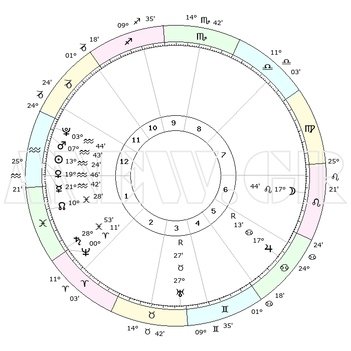 | | ΘΕΣΕΙΣ ΠΛΑΝΗΤΩΝ ΑΣΤΡΟΛΟΓΙΚΟΥ ΧΑΡΤΗ ΤΗΣ ΣΤΙΓΜΗΣ ΑΥΤΗΣ | | | | Πλανήτης | Ζώδιο | Μοίρες | Δεκαήμ. | Σε οίκο | Απόκλιση | | Ακμές των οίκων | | Ηλιος | Υδροχόος | 13°20' | Δεύτερο | 1 | 16 S 49 | | 1ος | 24°17' | Αιγόκερως | | Σελήνη | Λέων | 16°47' | Δεύτερο | 7 | 17 N 42 | | 2ος | 07°19' | Ιχθείς | | Ερμής | Υδροχόος | 21°35' | Τρίτο | 1 | 16 S 01 | | 3ος | 16°35' | Κριός | | Αφροδίτη | Υδροχόος | 19°41' | Δεύτερο | 1 | 16 S 13 | | 4ος | 16°04' | Ταύρος | | Αρης | Υδροχόος | 07°40' | Πρώτο | 1 | 19 S 22 | | 5ος | 09°18' | Δίδυμοι | | Δίας | Καρκίνος | 17°13'R | Δεύτερο | 6 | 22 N 38 | | 6ος | 00°33' | Καρκίνος | | Κρόνος | Ιχθείς | 28°52' | Τρίτο | 2 | 02 S 26 | | 7ος | 24°17' | Καρκίνος | | Ουρανός | Ταύρος | 27°28'R | Τρίτο | 4 | 19 N 24 | | 8ος | 07°19' | Παρθένος | | Ποσειδώνας | Κριός | 00°11' | Πρώτο | 2 | 01 S 08 | | 9ος | 16°35' | Ζυγός | | Πλούτωνας | Υδροχόος | 03°44' | Πρώτο | 1 | 23 S 01 | | 10ος | 16°04' | Σκορπιός | | Β. Δεσμός | Ιχθείς | 10°28' | Δεύτερο | 2 | 07 S 39 | | 11ος | 09°18' | Τοξότης | | Ωροσκόπος | Αιγόκερως | 24°17' | Τρίτο | | | 12ος | 00°33' | Αιγόκερως | | Μεσουράνημα | Σκορπιός | 16°04' | Δεύτερο | | | |