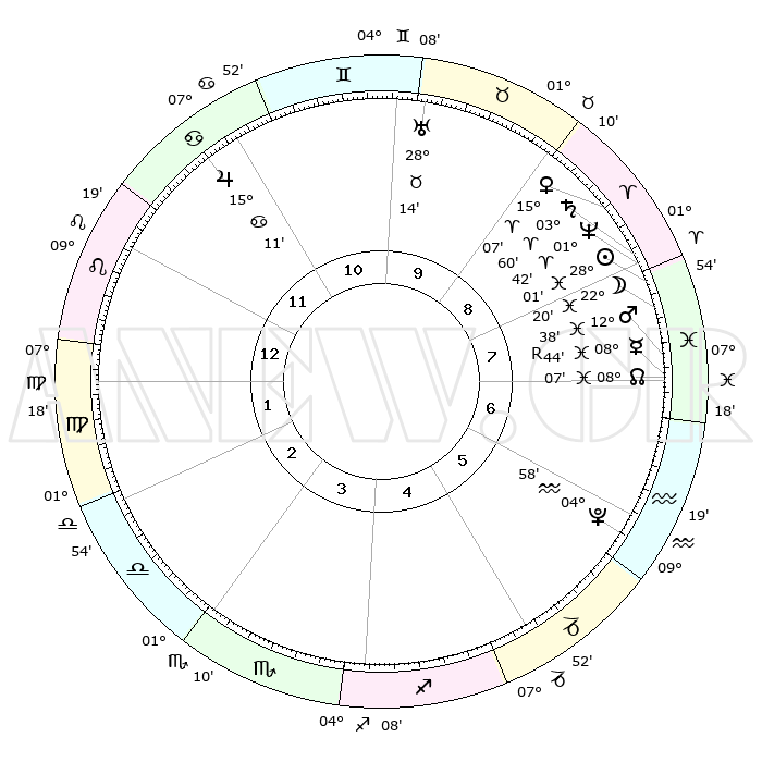 | | ΘΕΣΕΙΣ ΠΛΑΝΗΤΩΝ ΑΣΤΡΟΛΟΓΙΚΟΥ ΧΑΡΤΗ ΤΗΣ ΣΤΙΓΜΗΣ ΑΥΤΗΣ | | | | Πλανήτης | Ζώδιο | Μοίρες | Δεκαήμ. | Σε οίκο | Απόκλιση | | Ακμές των οίκων | | Ηλιος | Ιχθείς | 27°58' | Τρίτο | 8 | 00 S 49 | | 1ος | 19°56' | Λέων | | Σελήνη | Ιχθείς | 21°30' | Τρίτο | 8 | 02 S 19 | | 2ος | 12°44' | Παρθένος | | Ερμής | Ιχθείς | 08°45'R | Πρώτο | 7 | 06 S 51 | | 3ος | 10°22' | Ζυγός | | Αφροδίτη | Κριός | 15°03' | Δεύτερο | 9 | 05 N 04 | | 4ος | 13°02' | Σκορπιός | | Αρης | Ιχθείς | 12°35' | Δεύτερο | 7 | 07 S 50 | | 5ος | 17°57' | Τοξότης | | Δίας | Καρκίνος | 15°10' | Δεύτερο | 11 | 22 N 56 | | 6ος | 20°51' | Αιγόκερως | | Κρόνος | Κριός | 03°59' | Πρώτο | 8 | 00 S 22 | | 7ος | 19°56' | Υδροχόος | | Ουρανός | Ταύρος | 28°14' | Τρίτο | 10 | 19 N 35 | | 8ος | 12°44' | Ιχθείς | | Ποσειδώνας | Κριός | 01°42' | Πρώτο | 8 | 00 S 31 | | 9ος | 10°22' | Κριός | | Πλούτωνας | Υδροχόος | 04°58' | Πρώτο | 6 | 22 S 49 | | 10ος | 13°02' | Ταύρος | | Β. Δεσμός | Ιχθείς | 08°07' | Πρώτο | 7 | 08 S 31 | | 11ος | 17°57' | Δίδυμοι | | Ωροσκόπος | Λέων | 19°56' | Δεύτερο | | | 12ος | 20°51' | Καρκίνος | | Μεσουράνημα | Ταύρος | 13°02' | Δεύτερο | | | |