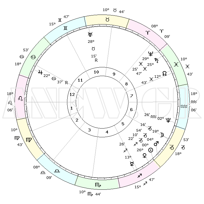 | | ΘΕΣΕΙΣ ΠΛΑΝΗΤΩΝ ΑΣΤΡΟΛΟΓΙΚΟΥ ΧΑΡΤΗ ΤΗΣ ΣΤΙΓΜΗΣ ΑΥΤΗΣ | | | | Πλανήτης | Ζώδιο | Μοίρες | Δεκαήμ. | Σε οίκο | Απόκλιση | | Ακμές των οίκων | | Ηλιος | Αιγόκερως | 00°05' | Πρώτο | 6 | 23 S 26 | | 1ος | 23°50' | Καρκίνος | | Σελήνη | Αιγόκερως | 18°15' | Δεύτερο | 6 | 26 S 11 | | 2ος | 14°32' | Λέων | | Ερμής | Τοξότης | 13°19' | Δεύτερο | 5 | 21 S 43 | | 3ος | 08°45' | Παρθένος | | Αφροδίτη | Τοξότης | 26°16' | Τρίτο | 6 | 23 S 29 | | 4ος | 08°57' | Ζυγός | | Αρης | Αιγόκερως | 04°51' | Πρώτο | 6 | 24 S 10 | | 5ος | 15°02' | Σκορπιός | | Δίας | Καρκίνος | 22°38'R | Τρίτο | 12 | 21 N 45 | | 6ος | 21°47' | Τοξότης | | Κρόνος | Ιχθείς | 25°46' | Τρίτο | 9 | 03 S 47 | | 7ος | 23°50' | Αιγόκερως | | Ουρανός | Ταύρος | 28°16'R | Τρίτο | 11 | 19 N 34 | | 8ος | 14°32' | Υδροχόος | | Ποσειδώνας | Ιχθείς | 29°25' | Τρίτο | 9 | 01 S 28 | | 9ος | 08°45' | Ιχθείς | | Πλούτωνας | Υδροχόος | 02°25' | Πρώτο | 7 | 23 S 17 | | 10ος | 08°57' | Κριός | | Β. Δεσμός | Ιχθείς | 12°43' | Δεύτερο | 9 | 06 S 47 | | 11ος | 15°02' | Ταύρος | | Ωροσκόπος | Καρκίνος | 23°50' | Τρίτο | | | 12ος | 21°47' | Δίδυμοι | | Μεσουράνημα | Κριός | 08°57' | Πρώτο | | | |