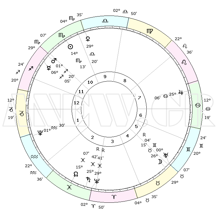 | | ΘΕΣΕΙΣ ΠΛΑΝΗΤΩΝ ΑΣΤΡΟΛΟΓΙΚΟΥ ΧΑΡΤΗ ΤΗΣ ΣΤΙΓΜΗΣ ΑΥΤΗΣ | | | | Πλανήτης | Ζώδιο | Μοίρες | Δεκαήμ. | Σε οίκο | Απόκλιση | | Ακμές των οίκων | | Ηλιος | Σκορπιός | 14°08' | Δεύτερο | 11 | 16 S 04 | | 1ος | 11°55' | Τοξότης | | Σελήνη | Ταύρος | 24°49' | Τρίτο | 6 | 23 N 32 | | 2ος | 14°60' | Αιγόκερως | | Ερμής | Τοξότης | 06°03' | Πρώτο | 12 | 24 S 00 | | 3ος | 22°42' | Υδροχόος | | Αφροδίτη | Ζυγός | 29°13' | Τρίτο | 11 | 09 S 53 | | 4ος | 28°37' | Ιχθείς | | Αρης | Τοξότης | 01°16' | Πρώτο | 12 | 20 S 51 | | 5ος | 27°55' | Κριός | | Δίας | Καρκίνος | 25°06' | Τρίτο | 8 | 21 N 12 | | 6ος | 21°26' | Ταύρος | | Κρόνος | Ιχθείς | 25°42'R | Τρίτο | 3 | 03 S 57 | | 7ος | 11°55' | Δίδυμοι | | Ουρανός | Δίδυμοι | 00°04'R | Πρώτο | 6 | 19 N 57 | | 8ος | 14°60' | Καρκίνος | | Ποσειδώνας | Ιχθείς | 29°41'R | Τρίτο | 4 | 01 S 23 | | 9ος | 22°42' | Λέων | | Πλούτωνας | Υδροχόος | 01°30' | Πρώτο | 2 | 23 S 30 | | 10ος | 28°37' | Παρθένος | | Β. Δεσμός | Ιχθείς | 15°07' | Δεύτερο | 3 | 05 S 52 | | 11ος | 27°55' | Ζυγός | | Ωροσκόπος | Τοξότης | 11°55' | Δεύτερο | | | 12ος | 21°26' | Σκορπιός | | Μεσουράνημα | Παρθένος | 28°37' | Τρίτο | | | |