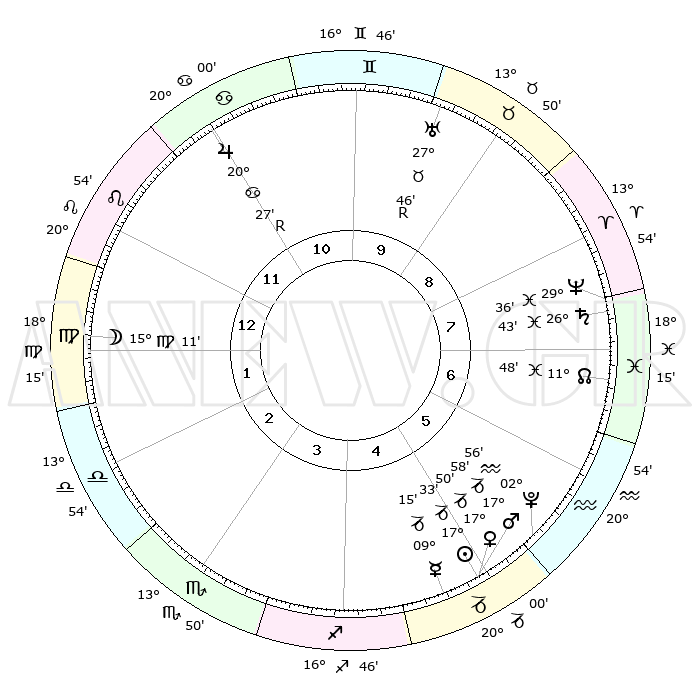 | | ΘΕΣΕΙΣ ΠΛΑΝΗΤΩΝ ΑΣΤΡΟΛΟΓΙΚΟΥ ΧΑΡΤΗ ΤΗΣ ΣΤΙΓΜΗΣ ΑΥΤΗΣ | | | | Πλανήτης | Ζώδιο | Μοίρες | Δεκαήμ. | Σε οίκο | Απόκλιση | | Ακμές των οίκων | | Ηλιος | Αιγόκερως | 16°17' | Δεύτερο | 7 | 22 S 26 | | 1ος | 04°25' | Καρκίνος | | Σελήνη | Λέων | 28°33' | Τρίτο | 3 | 12 N 57 | | 2ος | 24°59' | Καρκίνος | | Ερμής | Αιγόκερως | 07°18' | Πρώτο | 7 | 24 S 22 | | 3ος | 17°06' | Λέων | | Αφροδίτη | Αιγόκερως | 16°16' | Δεύτερο | 7 | 23 S 09 | | 4ος | 14°08' | Παρθένος | | Αρης | Αιγόκερως | 16°60' | Δεύτερο | 7 | 23 S 16 | | 5ος | 18°44' | Ζυγός | | Δίας | Καρκίνος | 20°37'R | Τρίτο | 1 | 22 N 06 | | 6ος | 28°21' | Σκορπιός | | Κρόνος | Ιχθείς | 26°38' | Τρίτο | 10 | 03 S 24 | | 7ος | 04°25' | Αιγόκερως | | Ουρανός | Ταύρος | 27°48'R | Τρίτο | 11 | 19 N 28 | | 8ος | 24°59' | Αιγόκερως | | Ποσειδώνας | Ιχθείς | 29°35' | Τρίτο | 10 | 01 S 23 | | 9ος | 17°06' | Υδροχόος | | Πλούτωνας | Υδροχόος | 02°54' | Πρώτο | 8 | 23 S 11 | | 10ος | 14°08' | Ιχθείς | | Β. Δεσμός | Ιχθείς | 11°52' | Δεύτερο | 9 | 07 S 06 | | 11ος | 18°44' | Κριός | | Ωροσκόπος | Καρκίνος | 04°25' | Πρώτο | | | 12ος | 28°21' | Ταύρος | | Μεσουράνημα | Ιχθείς | 14°08' | Δεύτερο | | | |