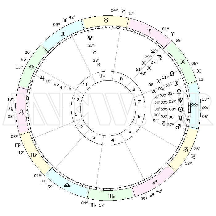 | | ΘΕΣΕΙΣ ΠΛΑΝΗΤΩΝ ΑΣΤΡΟΛΟΓΙΚΟΥ ΧΑΡΤΗ ΤΗΣ ΣΤΙΓΜΗΣ ΑΥΤΗΣ | | | | Πλανήτης | Ζώδιο | Μοίρες | Δεκαήμ. | Σε οίκο | Απόκλιση | | Ακμές των οίκων | | Ηλιος | Υδροχόος | 00°32' | Πρώτο | 7 | 20 S 02 | | 1ος | 12°44' | Καρκίνος | | Σελήνη | Υδροχόος | 21°01' | Τρίτο | 8 | 16 S 02 | | 2ος | 03°09' | Λέων | | Ερμής | Αιγόκερως | 29°50' | Τρίτο | 7 | 22 S 10 | | 3ος | 26°03' | Λέων | | Αφροδίτη | Υδροχόος | 03°51' | Πρώτο | 8 | 20 S 23 | | 4ος | 24°28' | Παρθένος | | Αρης | Αιγόκερως | 27°50' | Τρίτο | 7 | 21 S 34 | | 5ος | 00°01' | Σκορπιός | | Δίας | Καρκίνος | 18°44'R | Δεύτερο | 1 | 22 N 24 | | 6ος | 08°34' | Τοξότης | | Κρόνος | Ιχθείς | 27°42' | Τρίτο | 10 | 02 S 56 | | 7ος | 12°44' | Αιγόκερως | | Ουρανός | Ταύρος | 27°33'R | Τρίτο | 11 | 19 N 25 | | 8ος | 03°09' | Υδροχόος | | Ποσειδώνας | Ιχθείς | 29°51' | Τρίτο | 10 | 01 S 16 | | 9ος | 26°03' | Υδροχόος | | Πλούτωνας | Υδροχόος | 03°20' | Πρώτο | 8 | 23 S 06 | | 10ος | 24°28' | Ιχθείς | | Β. Δεσμός | Ιχθείς | 11°08' | Δεύτερο | 9 | 07 S 23 | | 11ος | 00°01' | Ταύρος | | Ωροσκόπος | Καρκίνος | 12°44' | Δεύτερο | | | 12ος | 08°34' | Δίδυμοι | | Μεσουράνημα | Ιχθείς | 24°28' | Τρίτο | | | |