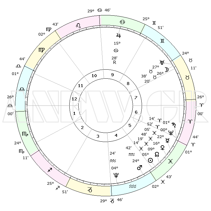 | | ΘΕΣΕΙΣ ΠΛΑΝΗΤΩΝ ΑΣΤΡΟΛΟΓΙΚΟΥ ΧΑΡΤΗ ΤΗΣ ΣΤΙΓΜΗΣ ΑΥΤΗΣ | | | | Πλανήτης | Ζώδιο | Μοίρες | Δεκαήμ. | Σε οίκο | Απόκλιση | | Ακμές των οίκων | | Ηλιος | Ιχθείς | 05°11' | Πρώτο | 5 | 09 S 37 | | 1ος | 10°07' | Ζυγός | | Σελήνη | Ταύρος | 25°34' | Τρίτο | 8 | 24 N 08 | | 2ος | 07°23' | Σκορπιός | | Ερμής | Ιχθείς | 22°03' | Τρίτο | 6 | 01 S 07 | | 3ος | 08°13' | Τοξότης | | Αφροδίτη | Ιχθείς | 16°44' | Δεύτερο | 6 | 06 S 33 | | 4ος | 11°24' | Αιγόκερως | | Αρης | Υδροχόος | 24°39' | Τρίτο | 5 | 14 S 20 | | 5ος | 14°20' | Υδροχόος | | Δίας | Καρκίνος | 15°28'R | Δεύτερο | 10 | 22 N 52 | | 6ος | 14°20' | Ιχθείς | | Κρόνος | Κριός | 01°14' | Πρώτο | 6 | 01 S 28 | | 7ος | 10°07' | Κριός | | Ουρανός | Ταύρος | 27°38' | Τρίτο | 8 | 19 N 27 | | 8ος | 07°23' | Ταύρος | | Ποσειδώνας | Κριός | 00°52' | Πρώτο | 6 | 00 S 51 | | 9ος | 08°13' | Δίδυμοι | | Πλούτωνας | Υδροχόος | 04°24' | Πρώτο | 4 | 22 S 54 | | 10ος | 11°24' | Καρκίνος | | Β. Δεσμός | Ιχθείς | 09°19' | Πρώτο | 5 | 08 S 04 | | 11ος | 14°20' | Λέων | | Ωροσκόπος | Ζυγός | 10°07' | Δεύτερο | | | 12ος | 14°20' | Παρθένος | | Μεσουράνημα | Καρκίνος | 11°24' | Δεύτερο | | | |