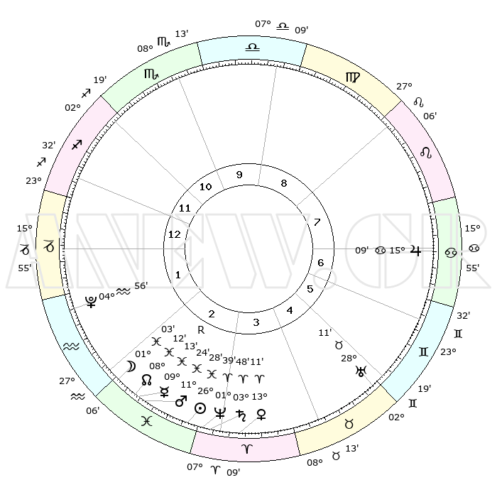 | | ΘΕΣΕΙΣ ΠΛΑΝΗΤΩΝ ΑΣΤΡΟΛΟΓΙΚΟΥ ΧΑΡΤΗ ΤΗΣ ΣΤΙΓΜΗΣ ΑΥΤΗΣ | | | | Πλανήτης | Ζώδιο | Μοίρες | Δεκαήμ. | Σε οίκο | Απόκλιση | | Ακμές των οίκων | | Ηλιος | Ιχθείς | 26°24' | Τρίτο | 3 | 01 S 26 | | 1ος | 24°25' | Τοξότης | | Σελήνη | Ιχθείς | 00°13' | Πρώτο | 2 | 12 S 09 | | 2ος | 00°11' | Υδροχόος | | Ερμής | Ιχθείς | 09°15'R | Πρώτο | 2 | 06 S 18 | | 3ος | 09°40' | Ιχθείς | | Αφροδίτη | Κριός | 13°06' | Δεύτερο | 3 | 04 N 16 | | 4ος | 14°26' | Κριός | | Αρης | Ιχθείς | 11°21' | Δεύτερο | 3 | 08 S 19 | | 5ος | 11°39' | Ταύρος | | Δίας | Καρκίνος | 15°08' | Δεύτερο | 7 | 22 N 56 | | 6ος | 03°53' | Δίδυμοι | | Κρόνος | Κριός | 03°47' | Πρώτο | 3 | 00 S 27 | | 7ος | 24°25' | Δίδυμοι | | Ουρανός | Ταύρος | 28°11' | Τρίτο | 5 | 19 N 35 | | 8ος | 00°11' | Λέων | | Ποσειδώνας | Κριός | 01°39' | Πρώτο | 3 | 00 S 33 | | 9ος | 09°40' | Παρθένος | | Πλούτωνας | Υδροχόος | 04°56' | Πρώτο | 2 | 22 S 49 | | 10ος | 14°26' | Ζυγός | | Β. Δεσμός | Ιχθείς | 08°12' | Πρώτο | 2 | 08 S 30 | | 11ος | 11°39' | Σκορπιός | | Ωροσκόπος | Τοξότης | 24°25' | Τρίτο | | | 12ος | 03°53' | Τοξότης | | Μεσουράνημα | Ζυγός | 14°26' | Δεύτερο | | | |