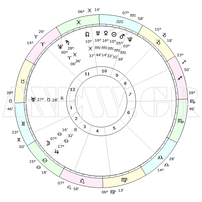 | | ΘΕΣΕΙΣ ΠΛΑΝΗΤΩΝ ΑΣΤΡΟΛΟΓΙΚΟΥ ΧΑΡΤΗ ΤΗΣ ΣΤΙΓΜΗΣ ΑΥΤΗΣ | | | | Πλανήτης | Ζώδιο | Μοίρες | Δεκαήμ. | Σε οίκο | Απόκλιση | | Ακμές των οίκων | | Ηλιος | Υδροχόος | 10°29' | Δεύτερο | 10 | 17 S 36 | | 1ος | 03°55' | Ταύρος | | Σελήνη | Καρκίνος | 06°30' | Πρώτο | 3 | 27 N 54 | | 2ος | 05°04' | Δίδυμοι | | Ερμής | Υδροχόος | 16°38' | Δεύτερο | 11 | 17 S 43 | | 3ος | 28°14' | Δίδυμοι | | Αφροδίτη | Υδροχόος | 16°10' | Δεύτερο | 11 | 17 S 16 | | 4ος | 19°57' | Καρκίνος | | Αρης | Υδροχόος | 05°28' | Πρώτο | 10 | 19 S 54 | | 5ος | 14°45' | Λέων | | Δίας | Καρκίνος | 17°32'R | Δεύτερο | 3 | 22 N 35 | | 6ος | 18°15' | Παρθένος | | Κρόνος | Ιχθείς | 28°36' | Τρίτο | 12 | 02 S 33 | | 7ος | 03°55' | Σκορπιός | | Ουρανός | Ταύρος | 27°28'R | Τρίτο | 1 | 19 N 24 | | 8ος | 05°04' | Τοξότης | | Ποσειδώνας | Κριός | 00°06' | Πρώτο | 12 | 01 S 10 | | 9ος | 28°14' | Τοξότης | | Πλούτωνας | Υδροχόος | 03°39' | Πρώτο | 10 | 23 S 02 | | 10ος | 19°57' | Αιγόκερως | | Β. Δεσμός | Ιχθείς | 10°37' | Δεύτερο | 11 | 07 S 35 | | 11ος | 14°45' | Υδροχόος | | Ωροσκόπος | Ταύρος | 03°55' | Πρώτο | | | 12ος | 18°15' | Ιχθείς | | Μεσουράνημα | Αιγόκερως | 19°57' | Δεύτερο | | | |