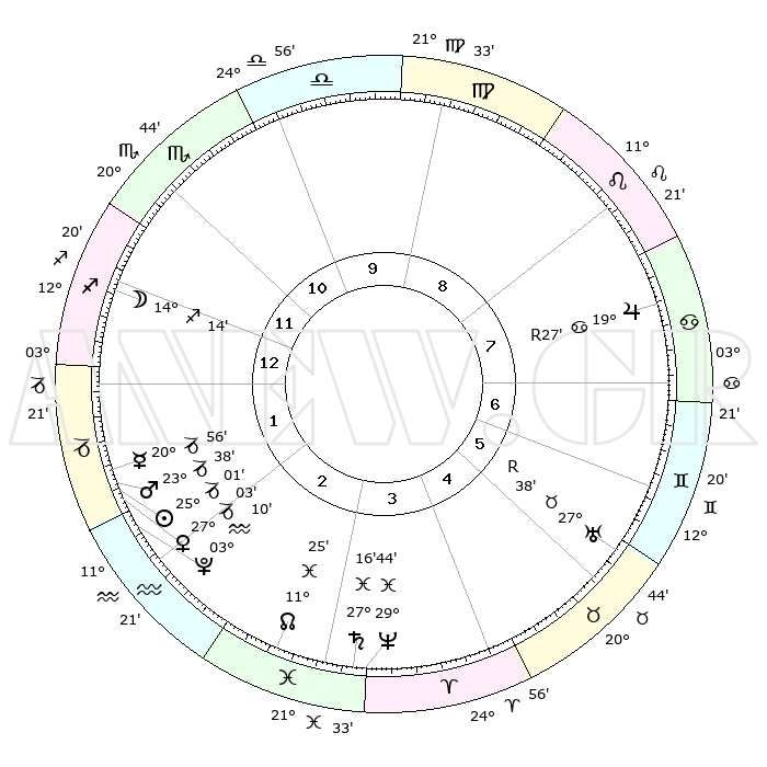 | | ΘΕΣΕΙΣ ΠΛΑΝΗΤΩΝ ΑΣΤΡΟΛΟΓΙΚΟΥ ΧΑΡΤΗ ΤΗΣ ΣΤΙΓΜΗΣ ΑΥΤΗΣ | | | | Πλανήτης | Ζώδιο | Μοίρες | Δεκαήμ. | Σε οίκο | Απόκλιση | | Ακμές των οίκων | | Ηλιος | Αιγόκερως | 24°57' | Τρίτο | 2 | 21 S 08 | | 1ος | 13°39' | Τοξότης | | Σελήνη | Τοξότης | 13°30' | Δεύτερο | 12 | 27 S 29 | | 2ος | 17°04' | Αιγόκερως | | Ερμής | Αιγόκερως | 20°50' | Τρίτο | 2 | 23 S 35 | | 3ος | 25°03' | Υδροχόος | | Αφροδίτη | Αιγόκερως | 26°59' | Τρίτο | 2 | 21 S 43 | | 4ος | 00°51' | Κριός | | Αρης | Αιγόκερως | 23°35' | Τρίτο | 2 | 22 S 20 | | 5ος | 29°53' | Κριός | | Δίας | Καρκίνος | 19°28'R | Δεύτερο | 8 | 22 N 17 | | 6ος | 23°12' | Ταύρος | | Κρόνος | Ιχθείς | 27°15' | Τρίτο | 3 | 03 S 08 | | 7ος | 13°39' | Δίδυμοι | | Ουρανός | Ταύρος | 27°38'R | Τρίτο | 6 | 19 N 26 | | 8ος | 17°04' | Καρκίνος | | Ποσειδώνας | Ιχθείς | 29°44' | Τρίτο | 3 | 01 S 19 | | 9ος | 25°03' | Λέων | | Πλούτωνας | Υδροχόος | 03°10' | Πρώτο | 2 | 23 S 08 | | 10ος | 00°51' | Ζυγός | | Β. Δεσμός | Ιχθείς | 11°25' | Δεύτερο | 3 | 07 S 17 | | 11ος | 29°53' | Ζυγός | | Ωροσκόπος | Τοξότης | 13°39' | Δεύτερο | | | 12ος | 23°12' | Σκορπιός | | Μεσουράνημα | Ζυγός | 00°51' | Πρώτο | | | |