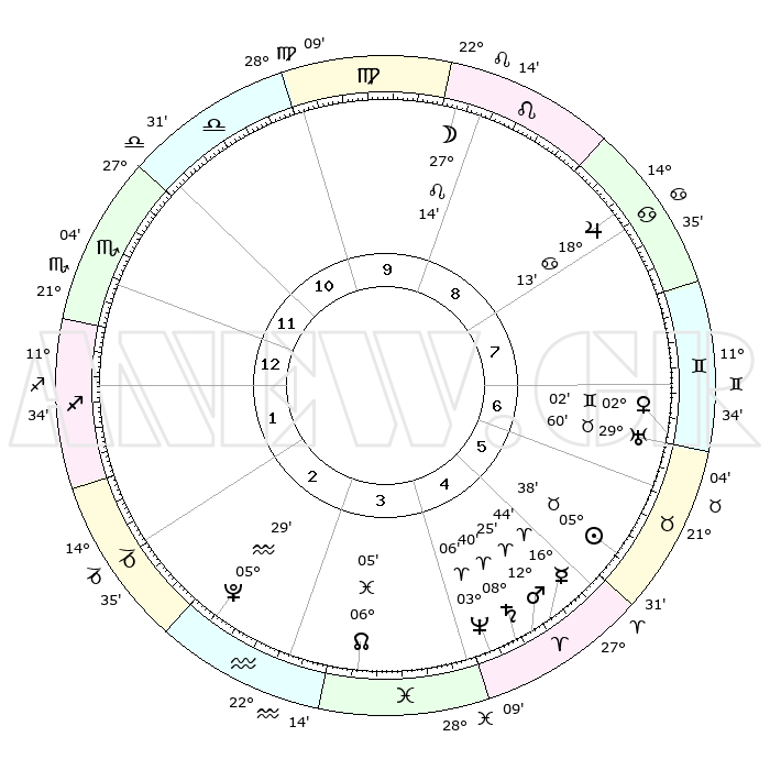 | | ΘΕΣΕΙΣ ΠΛΑΝΗΤΩΝ ΑΣΤΡΟΛΟΓΙΚΟΥ ΧΑΡΤΗ ΤΗΣ ΣΤΙΓΜΗΣ ΑΥΤΗΣ | | | | Πλανήτης | Ζώδιο | Μοίρες | Δεκαήμ. | Σε οίκο | Απόκλιση | | Ακμές των οίκων | | Ηλιος | Ταύρος | 05°34' | Πρώτο | 6 | 13 N 22 | | 1ος | 22°22' | Σκορπιός | | Σελήνη | Λέων | 26°23' | Τρίτο | 9 | 13 N 38 | | 2ος | 22°33' | Τοξότης | | Ερμής | Κριός | 16°37' | Δεύτερο | 5 | 04 N 20 | | 3ος | 27°03' | Αιγόκερως | | Αφροδίτη | Δίδυμοι | 01°57' | Πρώτο | 7 | 21 N 12 | | 4ος | 02°47' | Ιχθείς | | Αρης | Κριός | 12°22' | Δεύτερο | 5 | 04 N 02 | | 5ος | 04°39' | Κριός | | Δίας | Καρκίνος | 18°13' | Δεύτερο | 8 | 22 N 35 | | 6ος | 00°44' | Ταύρος | | Κρόνος | Κριός | 08°40' | Πρώτο | 5 | 01 N 27 | | 7ος | 22°22' | Ταύρος | | Ουρανός | Ταύρος | 29°59' | Τρίτο | 7 | 19 N 59 | | 8ος | 22°33' | Δίδυμοι | | Ποσειδώνας | Κριός | 03°06' | Πρώτο | 4 | 00 N 01 | | 9ος | 27°03' | Καρκίνος | | Πλούτωνας | Υδροχόος | 05°29' | Πρώτο | 3 | 22 S 48 | | 10ος | 02°47' | Παρθένος | | Β. Δεσμός | Ιχθείς | 06°06' | Πρώτο | 4 | 09 S 16 | | 11ος | 04°39' | Ζυγός | | Ωροσκόπος | Σκορπιός | 22°22' | Τρίτο | | | 12ος | 00°44' | Σκορπιός | | Μεσουράνημα | Παρθένος | 02°47' | Πρώτο | | | |