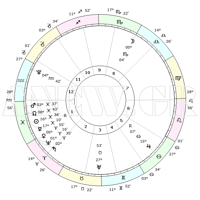 | | ΘΕΣΕΙΣ ΠΛΑΝΗΤΩΝ ΑΣΤΡΟΛΟΓΙΚΟΥ ΧΑΡΤΗ ΤΗΣ ΣΤΙΓΜΗΣ ΑΥΤΗΣ | | | | Πλανήτης | Ζώδιο | Μοίρες | Δεκαήμ. | Σε οίκο | Απόκλιση | | Ακμές των οίκων | | Ηλιος | Ιχθείς | 16°28' | Δεύτερο | 2 | 05 S 20 | | 1ος | 02°04' | Αιγόκερως | | Σελήνη | Ζυγός | 28°24' | Τρίτο | 10 | 14 S 39 | | 2ος | 09°45' | Υδροχόος | | Ερμής | Ιχθείς | 17°18'R | Δεύτερο | 2 | 01 S 38 | | 3ος | 19°52' | Ιχθείς | | Αφροδίτη | Κριός | 00°45' | Πρώτο | 3 | 00 S 51 | | 4ος | 23°29' | Κριός | | Αρης | Ιχθείς | 03°31' | Πρώτο | 2 | 11 S 14 | | 5ος | 19°28' | Ταύρος | | Δίας | Καρκίνος | 15°07'R | Δεύτερο | 7 | 22 N 56 | | 6ος | 11°08' | Δίδυμοι | | Κρόνος | Κριός | 02°34' | Πρώτο | 3 | 00 S 56 | | 7ος | 02°04' | Καρκίνος | | Ουρανός | Ταύρος | 27°53' | Τρίτο | 5 | 19 N 30 | | 8ος | 09°45' | Λέων | | Ποσειδώνας | Κριός | 01°16' | Πρώτο | 3 | 00 S 42 | | 9ος | 19°52' | Παρθένος | | Πλούτωνας | Υδροχόος | 04°42' | Πρώτο | 1 | 22 S 51 | | 10ος | 23°28' | Ζυγός | | Β. Δεσμός | Ιχθείς | 08°44' | Πρώτο | 2 | 08 S 18 | | 11ος | 19°28' | Σκορπιός | | Ωροσκόπος | Αιγόκερως | 02°04' | Πρώτο | | | 12ος | 11°08' | Τοξότης | | Μεσουράνημα | Ζυγός | 23°28' | Τρίτο | | | |