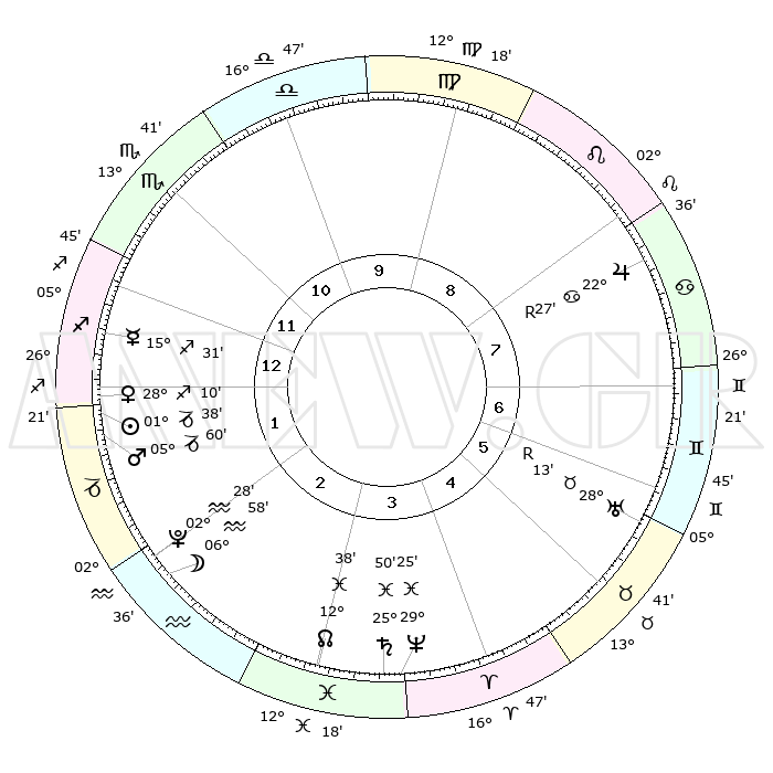 | | ΘΕΣΕΙΣ ΠΛΑΝΗΤΩΝ ΑΣΤΡΟΛΟΓΙΚΟΥ ΧΑΡΤΗ ΤΗΣ ΣΤΙΓΜΗΣ ΑΥΤΗΣ | | | | Πλανήτης | Ζώδιο | Μοίρες | Δεκαήμ. | Σε οίκο | Απόκλιση | | Ακμές των οίκων | | Ηλιος | Αιγόκερως | 01°32' | Πρώτο | 2 | 23 S 25 | | 1ος | 00°08' | Τοξότης | | Σελήνη | Υδροχόος | 05°53' | Πρώτο | 2 | 21 S 38 | | 2ος | 01°17' | Αιγόκερως | | Ερμής | Τοξότης | 15°24' | Δεύτερο | 1 | 22 S 09 | | 3ος | 07°01' | Υδροχόος | | Αφροδίτη | Τοξότης | 28°04' | Τρίτο | 1 | 23 S 35 | | 4ος | 13°03' | Ιχθείς | | Αρης | Αιγόκερως | 05°56' | Πρώτο | 2 | 24 S 08 | | 5ος | 14°04' | Κριός | | Δίας | Καρκίνος | 22°28'R | Τρίτο | 8 | 21 N 46 | | 6ος | 09°06' | Ταύρος | | Κρόνος | Ιχθείς | 25°50' | Τρίτο | 4 | 03 S 45 | | 7ος | 00°08' | Δίδυμοι | | Ουρανός | Ταύρος | 28°13'R | Τρίτο | 6 | 19 N 34 | | 8ος | 01°17' | Καρκίνος | | Ποσειδώνας | Ιχθείς | 29°25' | Τρίτο | 4 | 01 S 28 | | 9ος | 07°01' | Λέων | | Πλούτωνας | Υδροχόος | 02°28' | Πρώτο | 2 | 23 S 16 | | 10ος | 13°03' | Παρθένος | | Β. Δεσμός | Ιχθείς | 12°38' | Δεύτερο | 3 | 06 S 49 | | 11ος | 14°04' | Ζυγός | | Ωροσκόπος | Τοξότης | 00°08' | Πρώτο | | | 12ος | 09°06' | Σκορπιός | | Μεσουράνημα | Παρθένος | 13°03' | Δεύτερο | | | |