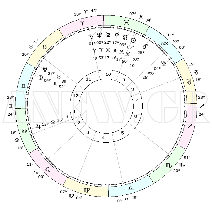 | | ΘΕΣΕΙΣ ΠΛΑΝΗΤΩΝ ΑΣΤΡΟΛΟΓΙΚΟΥ ΧΑΡΤΗ ΤΗΣ ΣΤΙΓΜΗΣ ΑΥΤΗΣ | | | | Πλανήτης | Ζώδιο | Μοίρες | Δεκαήμ. | Σε οίκο | Απόκλιση | | Ακμές των οίκων | | Ηλιος | Ιχθείς | 05°47' | Πρώτο | 10 | 09 S 23 | | 1ος | 11°01' | Δίδυμοι | | Σελήνη | Δίδυμοι | 04°10' | Πρώτο | 12 | 26 N 09 | | 2ος | 03°51' | Καρκίνος | | Ερμής | Ιχθείς | 22°16' | Τρίτο | 11 | 00 S 54 | | 3ος | 25°03' | Καρκίνος | | Αφροδίτη | Ιχθείς | 17°29' | Δεύτερο | 10 | 06 S 15 | | 4ος | 18°49' | Λέων | | Αρης | Υδροχόος | 25°08' | Τρίτο | 10 | 14 S 10 | | 5ος | 19°17' | Παρθένος | | Δίας | Καρκίνος | 15°26'R | Δεύτερο | 2 | 22 N 53 | | 6ος | 29°06' | Ζυγός | | Κρόνος | Κριός | 01°18' | Πρώτο | 11 | 01 S 27 | | 7ος | 11°01' | Τοξότης | | Ουρανός | Ταύρος | 27°38' | Τρίτο | 12 | 19 N 27 | | 8ος | 03°51' | Αιγόκερως | | Ποσειδώνας | Κριός | 00°53' | Πρώτο | 11 | 00 S 51 | | 9ος | 25°03' | Αιγόκερως | | Πλούτωνας | Υδροχόος | 04°25' | Πρώτο | 9 | 22 S 54 | | 10ος | 18°49' | Υδροχόος | | Β. Δεσμός | Ιχθείς | 09°17' | Πρώτο | 10 | 08 S 05 | | 11ος | 19°17' | Ιχθείς | | Ωροσκόπος | Δίδυμοι | 11°01' | Δεύτερο | | | 12ος | 29°06' | Κριός | | Μεσουράνημα | Υδροχόος | 18°49' | Δεύτερο | | | |