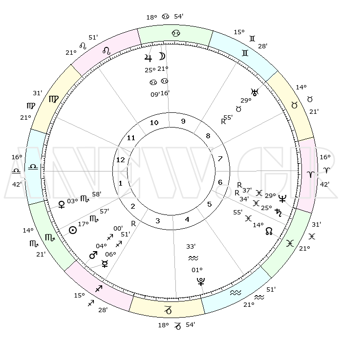 | | ΘΕΣΕΙΣ ΠΛΑΝΗΤΩΝ ΑΣΤΡΟΛΟΓΙΚΟΥ ΧΑΡΤΗ ΤΗΣ ΣΤΙΓΜΗΣ ΑΥΤΗΣ | | | | Πλανήτης | Ζώδιο | Μοίρες | Δεκαήμ. | Σε οίκο | Απόκλιση | | Ακμές των οίκων | | Ηλιος | Σκορπιός | 17°52' | Δεύτερο | 2 | 17 S 09 | | 1ος | 24°24' | Παρθένος | | Σελήνη | Καρκίνος | 20°12' | Τρίτο | 10 | 26 N 05 | | 2ος | 20°34' | Ζυγός | | Ερμής | Τοξότης | 06°52'R | Πρώτο | 3 | 23 S 44 | | 3ος | 20°46' | Σκορπιός | | Αφροδίτη | Σκορπιός | 03°53' | Πρώτο | 2 | 11 S 34 | | 4ος | 23°42' | Τοξότης | | Αρης | Τοξότης | 03°57' | Πρώτο | 3 | 21 S 24 | | 5ος | 26°47' | Αιγόκερως | | Δίας | Καρκίνος | 25°09' | Τρίτο | 10 | 21 N 12 | | 6ος | 27°26' | Υδροχόος | | Κρόνος | Ιχθείς | 25°34'R | Τρίτο | 7 | 04 S 00 | | 7ος | 24°24' | Ιχθείς | | Ουρανός | Ταύρος | 29°55'R | Τρίτο | 9 | 19 N 55 | | 8ος | 20°34' | Κριός | | Ποσειδώνας | Ιχθείς | 29°38'R | Τρίτο | 7 | 01 S 24 | | 9ος | 20°46' | Ταύρος | | Πλούτωνας | Υδροχόος | 01°32' | Πρώτο | 5 | 23 S 29 | | 10ος | 23°42' | Δίδυμοι | | Β. Δεσμός | Ιχθείς | 14°55' | Δεύτερο | 6 | 05 S 56 | | 11ος | 26°47' | Καρκίνος | | Ωροσκόπος | Παρθένος | 24°24' | Τρίτο | | | 12ος | 27°26' | Λέων | | Μεσουράνημα | Δίδυμοι | 23°42' | Τρίτο | | | |