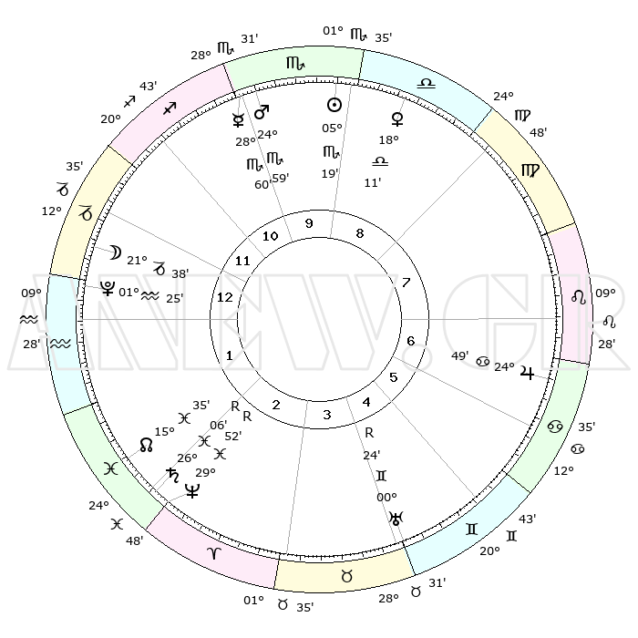 | | ΘΕΣΕΙΣ ΠΛΑΝΗΤΩΝ ΑΣΤΡΟΛΟΓΙΚΟΥ ΧΑΡΤΗ ΤΗΣ ΣΤΙΓΜΗΣ ΑΥΤΗΣ | | | | Πλανήτης | Ζώδιο | Μοίρες | Δεκαήμ. | Σε οίκο | Απόκλιση | | Ακμές των οίκων | | Ηλιος | Σκορπιός | 04°53' | Πρώτο | 2 | 13 S 09 | | 1ος | 22°44' | Παρθένος | | Σελήνη | Αιγόκερως | 16°22' | Δεύτερο | 4 | 26 S 52 | | 2ος | 18°46' | Ζυγός | | Ερμής | Σκορπιός | 28°32' | Τρίτο | 3 | 22 S 33 | | 3ος | 18°54' | Σκορπιός | | Αφροδίτη | Ζυγός | 17°39' | Δεύτερο | 1 | 05 S 32 | | 4ος | 21°50' | Τοξότης | | Αρης | Σκορπιός | 24°41' | Τρίτο | 3 | 19 S 17 | | 5ος | 24°57' | Αιγόκερως | | Δίας | Καρκίνος | 24°48' | Τρίτο | 10 | 21 N 14 | | 6ος | 25°39' | Υδροχόος | | Κρόνος | Ιχθείς | 26°07'R | Τρίτο | 7 | 03 S 49 | | 7ος | 22°44' | Ιχθείς | | Ουρανός | Δίδυμοι | 00°25'R | Πρώτο | 9 | 20 N 02 | | 8ος | 18°46' | Κριός | | Ποσειδώνας | Ιχθείς | 29°52'R | Τρίτο | 7 | 01 S 19 | | 9ος | 18°54' | Ταύρος | | Πλούτωνας | Υδροχόος | 01°25' | Πρώτο | 5 | 23 S 31 | | 10ος | 21°50' | Δίδυμοι | | Β. Δεσμός | Ιχθείς | 15°36' | Δεύτερο | 6 | 05 S 40 | | 11ος | 24°57' | Καρκίνος | | Ωροσκόπος | Παρθένος | 22°44' | Τρίτο | | | 12ος | 25°39' | Λέων | | Μεσουράνημα | Δίδυμοι | 21°50' | Τρίτο | | | |