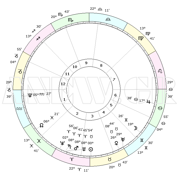 | | ΘΕΣΕΙΣ ΠΛΑΝΗΤΩΝ ΑΣΤΡΟΛΟΓΙΚΟΥ ΧΑΡΤΗ ΤΗΣ ΣΤΙΓΜΗΣ ΑΥΤΗΣ | | | | Πλανήτης | Ζώδιο | Μοίρες | Δεκαήμ. | Σε οίκο | Απόκλιση | | Ακμές των οίκων | | Ηλιος | Ταύρος | 00°51' | Πρώτο | 4 | 11 N 46 | | 1ος | 06°19' | Αιγόκερως | | Σελήνη | Δίδυμοι | 18°32' | Δεύτερο | 6 | 27 N 55 | | 2ος | 15°05' | Υδροχόος | | Ερμής | Κριός | 08°39' | Πρώτο | 3 | 01 N 02 | | 3ος | 25°22' | Ιχθείς | | Αφροδίτη | Ταύρος | 26°04' | Τρίτο | 5 | 19 N 42 | | 4ος | 28°14' | Κριός | | Αρης | Κριός | 08°38' | Πρώτο | 3 | 02 N 33 | | 5ος | 23°35' | Ταύρος | | Δίας | Καρκίνος | 17°37' | Δεύτερο | 7 | 22 N 39 | | 6ος | 15°03' | Δίδυμοι | | Κρόνος | Κριός | 08°06' | Πρώτο | 3 | 01 N 14 | | 7ος | 06°19' | Καρκίνος | | Ουρανός | Ταύρος | 29°44' | Τρίτο | 5 | 19 N 56 | | 8ος | 15°05' | Λέων | | Ποσειδώνας | Κριός | 02°56' | Πρώτο | 3 | 00 S 02 | | 9ος | 25°22' | Παρθένος | | Πλούτωνας | Υδροχόος | 05°27' | Πρώτο | 1 | 22 S 48 | | 10ος | 28°14' | Ζυγός | | Β. Δεσμός | Ιχθείς | 06°21' | Πρώτο | 2 | 09 S 11 | | 11ος | 23°35' | Σκορπιός | | Ωροσκόπος | Αιγόκερως | 06°19' | Πρώτο | | | 12ος | 15°03' | Τοξότης | | Μεσουράνημα | Ζυγός | 28°14' | Τρίτο | | | |