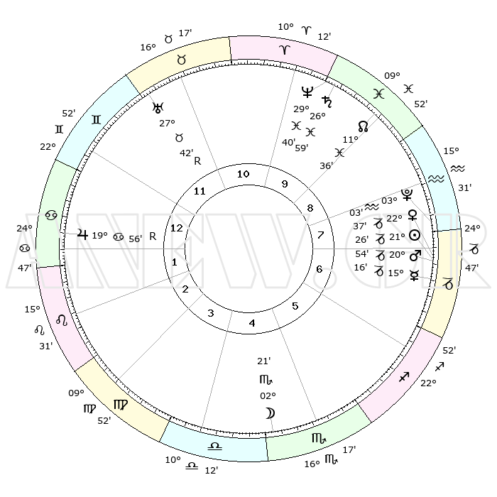 | | ΘΕΣΕΙΣ ΠΛΑΝΗΤΩΝ ΑΣΤΡΟΛΟΓΙΚΟΥ ΧΑΡΤΗ ΤΗΣ ΣΤΙΓΜΗΣ ΑΥΤΗΣ | | | | Πλανήτης | Ζώδιο | Μοίρες | Δεκαήμ. | Σε οίκο | Απόκλιση | | Ακμές των οίκων | | Ηλιος | Αιγόκερως | 21°06' | Τρίτο | 11 | 21 S 47 | | 1ος | 01°51' | Ιχθείς | | Σελήνη | Ζυγός | 28°28' | Τρίτο | 8 | 14 S 30 | | 2ος | 17°06' | Κριός | | Ερμής | Αιγόκερως | 14°45' | Δεύτερο | 11 | 24 S 09 | | 3ος | 19°27' | Ταύρος | | Αφροδίτη | Αιγόκερως | 22°13' | Τρίτο | 11 | 22 S 27 | | 4ος | 13°41' | Δίδυμοι | | Αρης | Αιγόκερως | 20°39' | Τρίτο | 11 | 22 S 47 | | 5ος | 05°22' | Καρκίνος | | Δίας | Καρκίνος | 19°58'R | Δεύτερο | 5 | 22 N 12 | | 6ος | 29°07' | Καρκίνος | | Κρόνος | Ιχθείς | 26°58' | Τρίτο | 1 | 03 S 15 | | 7ος | 01°51' | Παρθένος | | Ουρανός | Ταύρος | 27°42'R | Τρίτο | 3 | 19 N 27 | | 8ος | 17°06' | Ζυγός | | Ποσειδώνας | Ιχθείς | 29°40' | Τρίτο | 1 | 01 S 21 | | 9ος | 19°27' | Σκορπιός | | Πλούτωνας | Υδροχόος | 03°03' | Πρώτο | 12 | 23 S 09 | | 10ος | 13°41' | Τοξότης | | Β. Δεσμός | Ιχθείς | 11°37' | Δεύτερο | 1 | 07 S 12 | | 11ος | 05°22' | Αιγόκερως | | Ωροσκόπος | Ιχθείς | 01°51' | Πρώτο | | | 12ος | 29°07' | Αιγόκερως | | Μεσουράνημα | Τοξότης | 13°41' | Δεύτερο | | | |