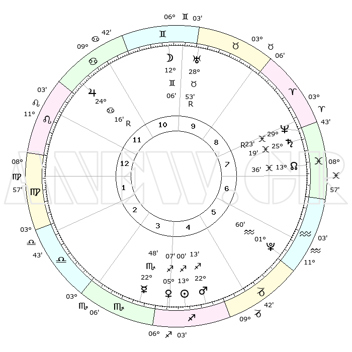 | | ΘΕΣΕΙΣ ΠΛΑΝΗΤΩΝ ΑΣΤΡΟΛΟΓΙΚΟΥ ΧΑΡΤΗ ΤΗΣ ΣΤΙΓΜΗΣ ΑΥΤΗΣ | | | | Πλανήτης | Ζώδιο | Μοίρες | Δεκαήμ. | Σε οίκο | Απόκλιση | | Ακμές των οίκων | | Ηλιος | Τοξότης | 12°58' | Δεύτερο | 4 | 22 S 21 | | 1ος | 27°24' | Λέων | | Σελήνη | Δίδυμοι | 11°30' | Δεύτερο | 10 | 27 N 06 | | 2ος | 20°59' | Παρθένος | | Ερμής | Σκορπιός | 22°46' | Τρίτο | 4 | 16 S 00 | | 3ος | 19°25' | Ζυγός | | Αφροδίτη | Τοξότης | 05°04' | Πρώτο | 4 | 20 S 35 | | 4ος | 22°17' | Σκορπιός | | Αρης | Τοξότης | 22°11' | Τρίτο | 4 | 23 S 54 | | 5ος | 26°40' | Τοξότης | | Δίας | Καρκίνος | 24°16'R | Τρίτο | 11 | 21 N 25 | | 6ος | 28°50' | Αιγόκερως | | Κρόνος | Ιχθείς | 25°19' | Τρίτο | 8 | 04 S 01 | | 7ος | 27°24' | Υδροχόος | | Ουρανός | Ταύρος | 28°53'R | Τρίτο | 10 | 19 N 42 | | 8ος | 20°59' | Ιχθείς | | Ποσειδώνας | Ιχθείς | 29°23'R | Τρίτο | 8 | 01 S 29 | | 9ος | 19°25' | Κριός | | Πλούτωνας | Υδροχόος | 01°60' | Πρώτο | 6 | 23 S 23 | | 10ος | 22°17' | Ταύρος | | Β. Δεσμός | Ιχθείς | 13°36' | Δεύτερο | 7 | 06 S 27 | | 11ος | 26°40' | Δίδυμοι | | Ωροσκόπος | Λέων | 27°24' | Τρίτο | | | 12ος | 28°50' | Καρκίνος | | Μεσουράνημα | Ταύρος | 22°17' | Τρίτο | | | |
