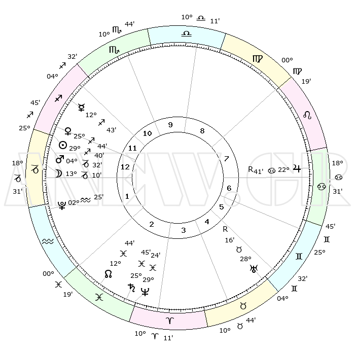 | | ΘΕΣΕΙΣ ΠΛΑΝΗΤΩΝ ΑΣΤΡΟΛΟΓΙΚΟΥ ΧΑΡΤΗ ΤΗΣ ΣΤΙΓΜΗΣ ΑΥΤΗΣ | | | | Πλανήτης | Ζώδιο | Μοίρες | Δεκαήμ. | Σε οίκο | Απόκλιση | | Ακμές των οίκων | | Ηλιος | Τοξότης | 29°36' | Τρίτο | 1 | 23 S 26 | | 1ος | 26°10' | Τοξότης | | Σελήνη | Αιγόκερως | 12°24' | Δεύτερο | 1 | 27 S 09 | | 2ος | 02°22' | Υδροχόος | | Ερμής | Τοξότης | 12°37' | Δεύτερο | 12 | 21 S 34 | | 3ος | 12°02' | Ιχθείς | | Αφροδίτη | Τοξότης | 25°39' | Τρίτο | 12 | 23 S 27 | | 4ος | 16°33' | Κριός | | Αρης | Αιγόκερως | 04°29' | Πρώτο | 1 | 24 S 11 | | 5ος | 13°29' | Ταύρος | | Δίας | Καρκίνος | 22°41'R | Τρίτο | 7 | 21 N 44 | | 6ος | 05°34' | Δίδυμοι | | Κρόνος | Ιχθείς | 25°45' | Τρίτο | 3 | 03 S 48 | | 7ος | 26°10' | Δίδυμοι | | Ουρανός | Ταύρος | 28°17'R | Τρίτο | 5 | 19 N 35 | | 8ος | 02°22' | Λέων | | Ποσειδώνας | Ιχθείς | 29°24' | Τρίτο | 3 | 01 S 28 | | 9ος | 12°02' | Παρθένος | | Πλούτωνας | Υδροχόος | 02°25' | Πρώτο | 2 | 23 S 17 | | 10ος | 16°33' | Ζυγός | | Β. Δεσμός | Ιχθείς | 12°44' | Δεύτερο | 3 | 06 S 47 | | 11ος | 13°29' | Σκορπιός | | Ωροσκόπος | Τοξότης | 26°10' | Τρίτο | | | 12ος | 05°34' | Τοξότης | | Μεσουράνημα | Ζυγός | 16°33' | Δεύτερο | | | |