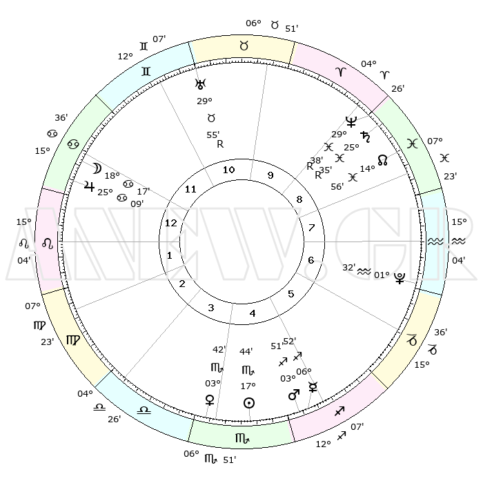 | | ΘΕΣΕΙΣ ΠΛΑΝΗΤΩΝ ΑΣΤΡΟΛΟΓΙΚΟΥ ΧΑΡΤΗ ΤΗΣ ΣΤΙΓΜΗΣ ΑΥΤΗΣ | | | | Πλανήτης | Ζώδιο | Μοίρες | Δεκαήμ. | Σε οίκο | Απόκλιση | | Ακμές των οίκων | | Ηλιος | Σκορπιός | 17°37' | Δεύτερο | 5 | 17 S 05 | | 1ος | 11°51' | Καρκίνος | | Σελήνη | Καρκίνος | 16°41' | Δεύτερο | 1 | 26 N 44 | | 2ος | 02°16' | Λέων | | Ερμής | Τοξότης | 06°52' | Πρώτο | 5 | 23 S 46 | | 3ος | 25°05' | Λέων | | Αφροδίτη | Σκορπιός | 03°34' | Πρώτο | 5 | 11 S 27 | | 4ος | 23°21' | Παρθένος | | Αρης | Τοξότης | 03°47' | Πρώτο | 5 | 21 S 22 | | 5ος | 28°49' | Ζυγός | | Δίας | Καρκίνος | 25°09' | Τρίτο | 1 | 21 N 12 | | 6ος | 07°30' | Τοξότης | | Κρόνος | Ιχθείς | 25°35'R | Τρίτο | 10 | 04 S 00 | | 7ος | 11°51' | Αιγόκερως | | Ουρανός | Ταύρος | 29°56'R | Τρίτο | 11 | 19 N 56 | | 8ος | 02°16' | Υδροχόος | | Ποσειδώνας | Ιχθείς | 29°38'R | Τρίτο | 10 | 01 S 24 | | 9ος | 25°05' | Υδροχόος | | Πλούτωνας | Υδροχόος | 01°32' | Πρώτο | 7 | 23 S 29 | | 10ος | 23°21' | Ιχθείς | | Β. Δεσμός | Ιχθείς | 14°56' | Δεύτερο | 9 | 05 S 56 | | 11ος | 28°49' | Κριός | | Ωροσκόπος | Καρκίνος | 11°51' | Δεύτερο | | | 12ος | 07°30' | Δίδυμοι | | Μεσουράνημα | Ιχθείς | 23°21' | Τρίτο | | | |