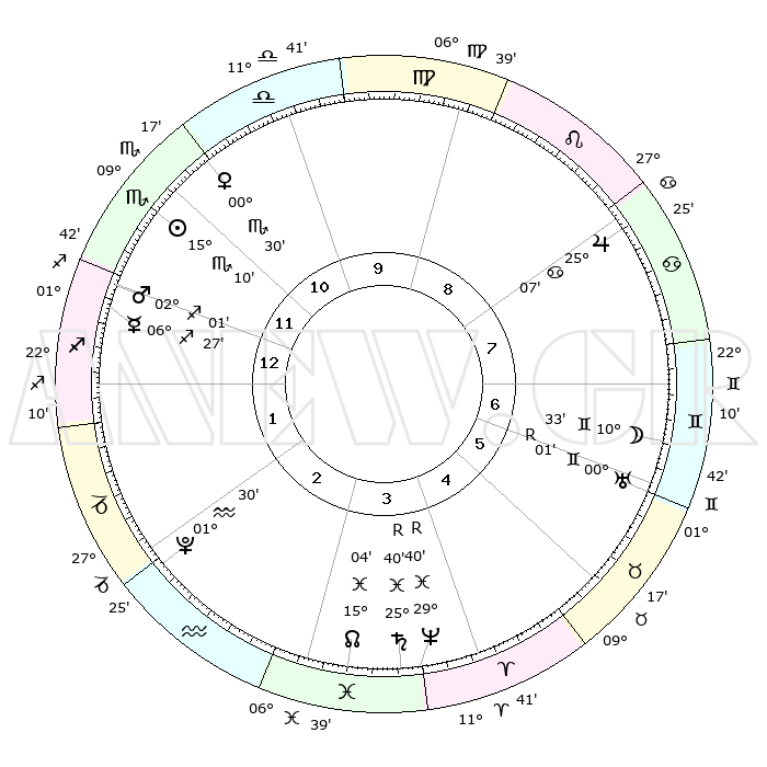 | | ΘΕΣΕΙΣ ΠΛΑΝΗΤΩΝ ΑΣΤΡΟΛΟΓΙΚΟΥ ΧΑΡΤΗ ΤΗΣ ΣΤΙΓΜΗΣ ΑΥΤΗΣ | | | | Πλανήτης | Ζώδιο | Μοίρες | Δεκαήμ. | Σε οίκο | Απόκλιση | | Ακμές των οίκων | | Ηλιος | Σκορπιός | 15°05' | Δεύτερο | 12 | 16 S 21 | | 1ος | 25°18' | Σκορπιός | | Σελήνη | Δίδυμοι | 09°12' | Πρώτο | 7 | 26 N 47 | | 2ος | 25°50' | Τοξότης | | Ερμής | Τοξότης | 06°25' | Πρώτο | 1 | 24 S 00 | | 3ος | 00°46' | Υδροχόος | | Αφροδίτη | Σκορπιός | 00°23' | Πρώτο | 11 | 10 S 19 | | 4ος | 06°40' | Ιχθείς | | Αρης | Τοξότης | 01°57' | Πρώτο | 1 | 20 S 59 | | 5ος | 08°14' | Κριός | | Δίας | Καρκίνος | 25°07' | Τρίτο | 8 | 21 N 12 | | 6ος | 03°55' | Ταύρος | | Κρόνος | Ιχθείς | 25°40'R | Τρίτο | 4 | 03 S 58 | | 7ος | 25°18' | Ταύρος | | Ουρανός | Δίδυμοι | 00°02'R | Πρώτο | 7 | 19 N 57 | | 8ος | 25°50' | Δίδυμοι | | Ποσειδώνας | Ιχθείς | 29°40'R | Τρίτο | 4 | 01 S 23 | | 9ος | 00°46' | Λέων | | Πλούτωνας | Υδροχόος | 01°30' | Πρώτο | 3 | 23 S 30 | | 10ος | 06°40' | Παρθένος | | Β. Δεσμός | Ιχθείς | 15°04' | Δεύτερο | 4 | 05 S 53 | | 11ος | 08°14' | Ζυγός | | Ωροσκόπος | Σκορπιός | 25°18' | Τρίτο | | | 12ος | 03°55' | Σκορπιός | | Μεσουράνημα | Παρθένος | 06°40' | Πρώτο | | | |