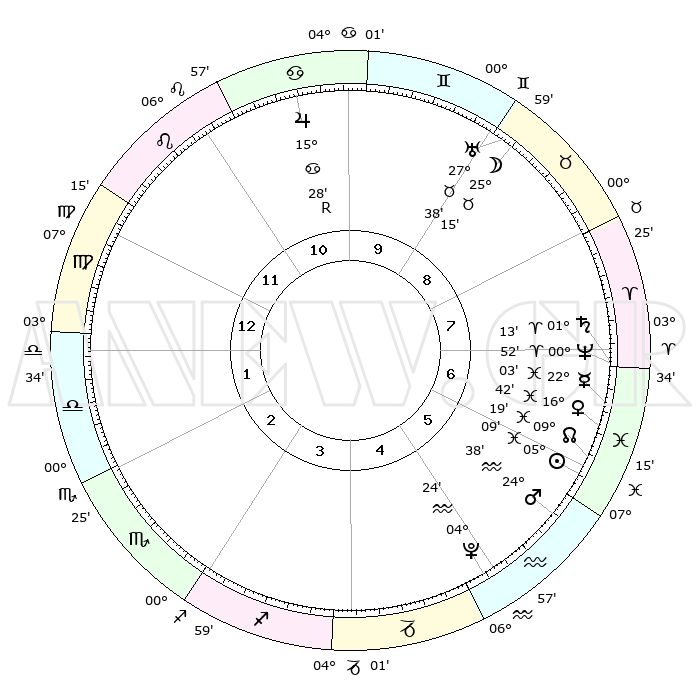 | | ΘΕΣΕΙΣ ΠΛΑΝΗΤΩΝ ΑΣΤΡΟΛΟΓΙΚΟΥ ΧΑΡΤΗ ΤΗΣ ΣΤΙΓΜΗΣ ΑΥΤΗΣ | | | | Πλανήτης | Ζώδιο | Μοίρες | Δεκαήμ. | Σε οίκο | Απόκλιση | | Ακμές των οίκων | | Ηλιος | Ιχθείς | 05°05' | Πρώτο | 6 | 09 S 39 | | 1ος | 13°43' | Παρθένος | | Σελήνη | Ταύρος | 24°18' | Τρίτο | 9 | 23 N 47 | | 2ος | 08°57' | Ζυγός | | Ερμής | Ιχθείς | 22°01' | Τρίτο | 7 | 01 S 09 | | 3ος | 08°38' | Σκορπιός | | Αφροδίτη | Ιχθείς | 16°37' | Δεύτερο | 7 | 06 S 36 | | 4ος | 11°35' | Τοξότης | | Αρης | Υδροχόος | 24°35' | Τρίτο | 6 | 14 S 21 | | 5ος | 14°60' | Αιγόκερως | | Δίας | Καρκίνος | 15°28'R | Δεύτερο | 11 | 22 N 52 | | 6ος | 16°06' | Υδροχόος | | Κρόνος | Κριός | 01°13' | Πρώτο | 7 | 01 S 29 | | 7ος | 13°44' | Ιχθείς | | Ουρανός | Ταύρος | 27°38' | Τρίτο | 9 | 19 N 27 | | 8ος | 08°57' | Κριός | | Ποσειδώνας | Κριός | 00°52' | Πρώτο | 7 | 00 S 51 | | 9ος | 08°38' | Ταύρος | | Πλούτωνας | Υδροχόος | 04°23' | Πρώτο | 5 | 22 S 54 | | 10ος | 11°35' | Δίδυμοι | | Β. Δεσμός | Ιχθείς | 09°19' | Πρώτο | 6 | 08 S 04 | | 11ος | 14°60' | Καρκίνος | | Ωροσκόπος | Παρθένος | 13°43' | Δεύτερο | | | 12ος | 16°06' | Λέων | | Μεσουράνημα | Δίδυμοι | 11°35' | Δεύτερο | | | |