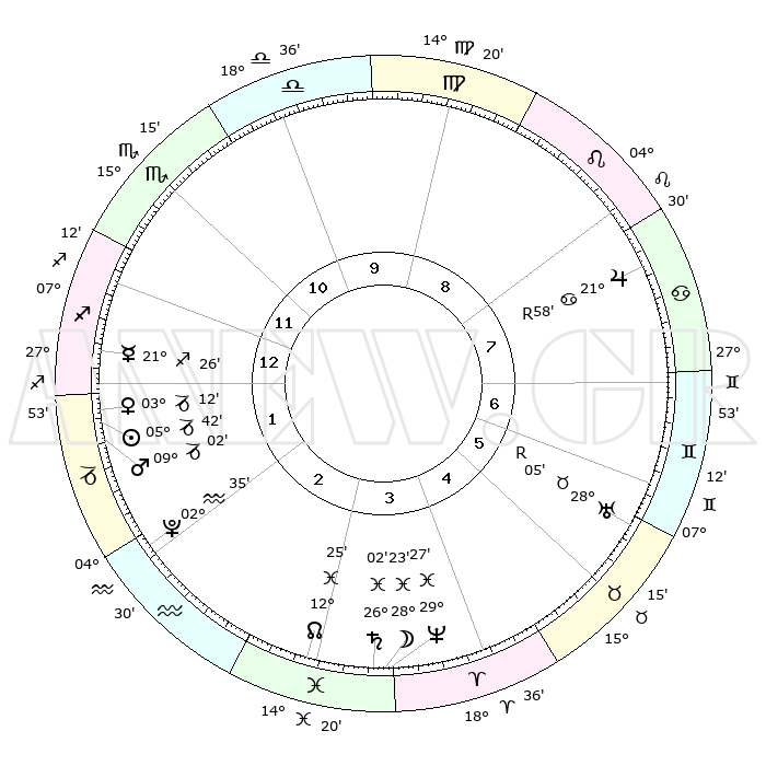 | | ΘΕΣΕΙΣ ΠΛΑΝΗΤΩΝ ΑΣΤΡΟΛΟΓΙΚΟΥ ΧΑΡΤΗ ΤΗΣ ΣΤΙΓΜΗΣ ΑΥΤΗΣ | | | | Πλανήτης | Ζώδιο | Μοίρες | Δεκαήμ. | Σε οίκο | Απόκλιση | | Ακμές των οίκων | | Ηλιος | Αιγόκερως | 05°37' | Πρώτο | 1 | 23 S 19 | | 1ος | 06°25' | Τοξότης | | Σελήνη | Ιχθείς | 27°27' | Τρίτο | 4 | 00 N 17 | | 2ος | 08°31' | Αιγόκερως | | Ερμής | Τοξότης | 21°20' | Τρίτο | 1 | 23 S 09 | | 3ος | 15°18' | Υδροχόος | | Αφροδίτη | Αιγόκερως | 03°07' | Πρώτο | 1 | 23 S 43 | | 4ος | 21°23' | Ιχθείς | | Αρης | Αιγόκερως | 08°59' | Πρώτο | 2 | 23 S 59 | | 5ος | 21°33' | Κριός | | Δίας | Καρκίνος | 21°58'R | Τρίτο | 8 | 21 N 52 | | 6ος | 15°44' | Ταύρος | | Κρόνος | Ιχθείς | 26°01' | Τρίτο | 4 | 03 S 40 | | 7ος | 06°25' | Δίδυμοι | | Ουρανός | Ταύρος | 28°05'R | Τρίτο | 6 | 19 N 32 | | 8ος | 08°31' | Καρκίνος | | Ποσειδώνας | Ιχθείς | 29°27' | Τρίτο | 4 | 01 S 27 | | 9ος | 15°18' | Λέων | | Πλούτωνας | Υδροχόος | 02°35' | Πρώτο | 2 | 23 S 15 | | 10ος | 21°23' | Παρθένος | | Β. Δεσμός | Ιχθείς | 12°26' | Δεύτερο | 3 | 06 S 54 | | 11ος | 21°33' | Ζυγός | | Ωροσκόπος | Τοξότης | 06°25' | Πρώτο | | | 12ος | 15°44' | Σκορπιός | | Μεσουράνημα | Παρθένος | 21°23' | Τρίτο | | | |
