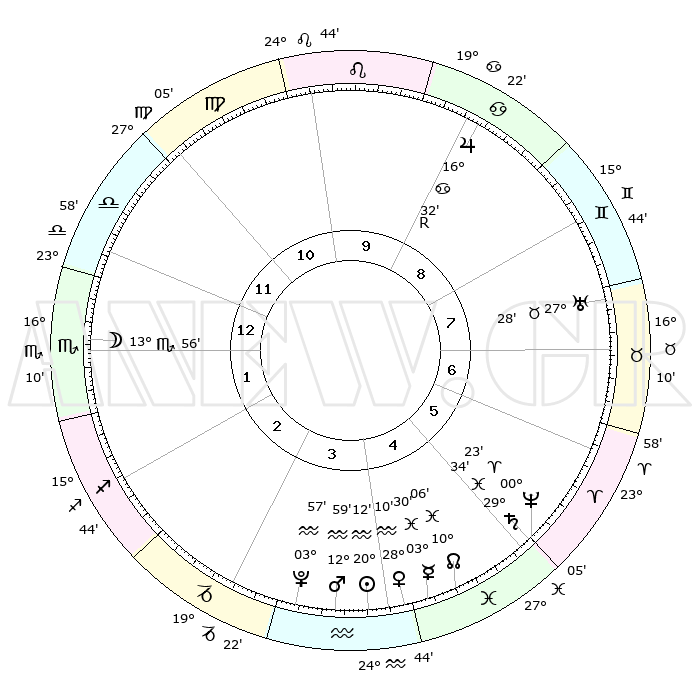 | | ΘΕΣΕΙΣ ΠΛΑΝΗΤΩΝ ΑΣΤΡΟΛΟΓΙΚΟΥ ΧΑΡΤΗ ΤΗΣ ΣΤΙΓΜΗΣ ΑΥΤΗΣ | | | | Πλανήτης | Ζώδιο | Μοίρες | Δεκαήμ. | Σε οίκο | Απόκλιση | | Ακμές των οίκων | | Ηλιος | Υδροχόος | 20°08' | Τρίτο | 4 | 14 S 46 | | 1ος | 27°13' | Ζυγός | | Σελήνη | Σκορπιός | 13°09' | Δεύτερο | 1 | 20 S 17 | | 2ος | 25°28' | Σκορπιός | | Ερμής | Ιχθείς | 03°24' | Πρώτο | 4 | 11 S 16 | | 3ος | 27°13' | Τοξότης | | Αφροδίτη | Υδροχόος | 28°05' | Τρίτο | 4 | 13 S 30 | | 4ος | 01°14' | Υδροχόος | | Αρης | Υδροχόος | 12°55' | Δεύτερο | 4 | 17 S 57 | | 5ος | 04°10' | Ιχθείς | | Δίας | Καρκίνος | 16°33'R | Δεύτερο | 9 | 22 N 43 | | 6ος | 03°05' | Κριός | | Κρόνος | Ιχθείς | 29°34' | Τρίτο | 5 | 02 S 09 | | 7ος | 27°13' | Κριός | | Ουρανός | Ταύρος | 27°28' | Τρίτο | 8 | 19 N 24 | | 8ος | 25°28' | Ταύρος | | Ποσειδώνας | Κριός | 00°22' | Πρώτο | 5 | 01 S 03 | | 9ος | 27°13' | Δίδυμοι | | Πλούτωνας | Υδροχόος | 03°57' | Πρώτο | 4 | 22 S 59 | | 10ος | 01°14' | Λέων | | Β. Δεσμός | Ιχθείς | 10°07' | Δεύτερο | 5 | 07 S 47 | | 11ος | 04°10' | Παρθένος | | Ωροσκόπος | Ζυγός | 27°13' | Τρίτο | | | 12ος | 03°05' | Ζυγός | | Μεσουράνημα | Λέων | 01°14' | Πρώτο | | | |