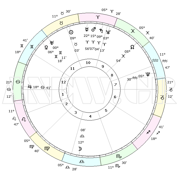 | | ΘΕΣΕΙΣ ΠΛΑΝΗΤΩΝ ΑΣΤΡΟΛΟΓΙΚΟΥ ΧΑΡΤΗ ΤΗΣ ΣΤΙΓΜΗΣ ΑΥΤΗΣ | | | | Πλανήτης | Ζώδιο | Μοίρες | Δεκαήμ. | Σε οίκο | Απόκλιση | | Ακμές των οίκων | | Ηλιος | Ταύρος | 08°60' | Πρώτο | 11 | 14 N 30 | | 1ος | 06°02' | Καρκίνος | | Σελήνη | Ζυγός | 11°31' | Δεύτερο | 4 | 07 S 11 | | 2ος | 26°33' | Καρκίνος | | Ερμής | Κριός | 22°51' | Τρίτο | 11 | 06 N 56 | | 3ος | 18°49' | Λέων | | Αφροδίτη | Δίδυμοι | 06°14' | Πρώτο | 12 | 22 N 09 | | 4ος | 16°07' | Παρθένος | | Αρης | Κριός | 15°05' | Δεύτερο | 10 | 05 N 06 | | 5ος | 20°56' | Ζυγός | | Δίας | Καρκίνος | 18°41' | Δεύτερο | 1 | 22 N 31 | | 6ος | 00°22' | Τοξότης | | Κρόνος | Κριός | 09°04' | Πρώτο | 10 | 01 N 36 | | 7ος | 06°02' | Αιγόκερως | | Ουρανός | Δίδυμοι | 00°11' | Πρώτο | 11 | 20 N 01 | | 8ος | 26°33' | Αιγόκερως | | Ποσειδώνας | Κριός | 03°13' | Πρώτο | 10 | 00 N 04 | | 9ος | 18°49' | Υδροχόος | | Πλούτωνας | Υδροχόος | 05°30' | Πρώτο | 8 | 22 S 49 | | 10ος | 16°07' | Ιχθείς | | Β. Δεσμός | Ιχθείς | 05°54' | Πρώτο | 9 | 09 S 21 | | 11ος | 20°56' | Κριός | | Ωροσκόπος | Καρκίνος | 06°02' | Πρώτο | | | 12ος | 00°22' | Δίδυμοι | | Μεσουράνημα | Ιχθείς | 16°07' | Δεύτερο | | | |