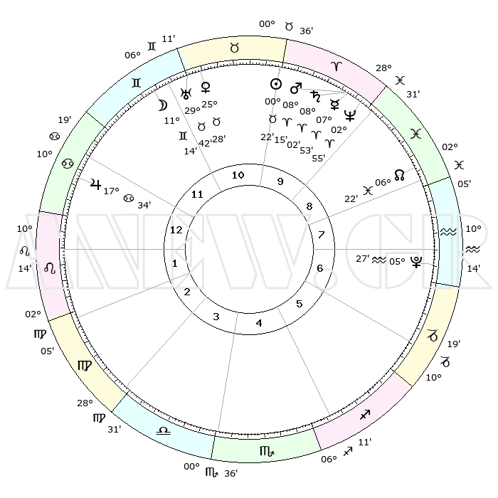 | | ΘΕΣΕΙΣ ΠΛΑΝΗΤΩΝ ΑΣΤΡΟΛΟΓΙΚΟΥ ΧΑΡΤΗ ΤΗΣ ΣΤΙΓΜΗΣ ΑΥΤΗΣ | | | | Πλανήτης | Ζώδιο | Μοίρες | Δεκαήμ. | Σε οίκο | Απόκλιση | | Ακμές των οίκων | | Ηλιος | Ταύρος | 00°18' | Πρώτο | 10 | 11 N 35 | | 1ος | 22°09' | Καρκίνος | | Σελήνη | Δίδυμοι | 10°19' | Δεύτερο | 11 | 27 N 02 | | 2ος | 12°46' | Λέων | | Ερμής | Κριός | 07°47' | Πρώτο | 10 | 00 N 41 | | 3ος | 06°47' | Παρθένος | | Αφροδίτη | Ταύρος | 25°23' | Τρίτο | 11 | 19 N 31 | | 4ος | 06°43' | Ζυγός | | Αρης | Κριός | 08°12' | Πρώτο | 10 | 02 N 23 | | 5ος | 12°47' | Σκορπιός | | Δίας | Καρκίνος | 17°33' | Δεύτερο | 12 | 22 N 40 | | 6ος | 19°48' | Τοξότης | | Κρόνος | Κριός | 08°02' | Πρώτο | 10 | 01 N 12 | | 7ος | 22°09' | Αιγόκερως | | Ουρανός | Ταύρος | 29°42' | Τρίτο | 11 | 19 N 55 | | 8ος | 12°46' | Υδροχόος | | Ποσειδώνας | Κριός | 02°55' | Πρώτο | 9 | 00 S 03 | | 9ος | 06°47' | Ιχθείς | | Πλούτωνας | Υδροχόος | 05°27' | Πρώτο | 7 | 22 S 48 | | 10ος | 06°44' | Κριός | | Β. Δεσμός | Ιχθείς | 06°23' | Πρώτο | 8 | 09 S 10 | | 11ος | 12°47' | Ταύρος | | Ωροσκόπος | Καρκίνος | 22°09' | Τρίτο | | | 12ος | 19°48' | Δίδυμοι | | Μεσουράνημα | Κριός | 06°44' | Πρώτο | | | |