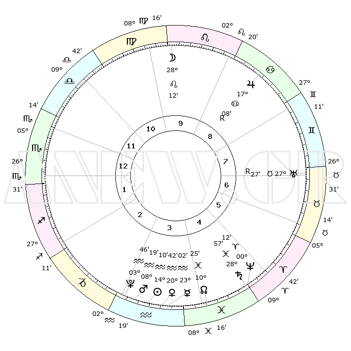 | | ΘΕΣΕΙΣ ΠΛΑΝΗΤΩΝ ΑΣΤΡΟΛΟΓΙΚΟΥ ΧΑΡΤΗ ΤΗΣ ΣΤΙΓΜΗΣ ΑΥΤΗΣ | | | | Πλανήτης | Ζώδιο | Μοίρες | Δεκαήμ. | Σε οίκο | Απόκλιση | | Ακμές των οίκων | | Ηλιος | Υδροχόος | 14°06' | Δεύτερο | 3 | 16 S 36 | | 1ος | 08°36' | Σκορπιός | | Σελήνη | Λέων | 27°21' | Τρίτο | 10 | 13 N 23 | | 2ος | 07°35' | Τοξότης | | Ερμής | Υδροχόος | 22°56' | Τρίτο | 4 | 15 S 31 | | 3ος | 10°19' | Αιγόκερως | | Αφροδίτη | Υδροχόος | 20°38' | Τρίτο | 4 | 15 S 56 | | 4ος | 15°08' | Υδροχόος | | Αρης | Υδροχόος | 08°16' | Πρώτο | 3 | 19 S 12 | | 5ος | 17°51' | Ιχθείς | | Δίας | Καρκίνος | 17°09'R | Δεύτερο | 9 | 22 N 38 | | 6ος | 15°39' | Κριός | | Κρόνος | Ιχθείς | 28°57' | Τρίτο | 5 | 02 S 25 | | 7ος | 08°36' | Ταύρος | | Ουρανός | Ταύρος | 27°27'R | Τρίτο | 7 | 19 N 24 | | 8ος | 07°35' | Δίδυμοι | | Ποσειδώνας | Κριός | 00°12' | Πρώτο | 5 | 01 S 08 | | 9ος | 10°19' | Καρκίνος | | Πλούτωνας | Υδροχόος | 03°46' | Πρώτο | 3 | 23 S 01 | | 10ος | 15°08' | Λέων | | Β. Δεσμός | Ιχθείς | 10°26' | Δεύτερο | 4 | 07 S 39 | | 11ος | 17°51' | Παρθένος | | Ωροσκόπος | Σκορπιός | 08°36' | Πρώτο | | | 12ος | 15°39' | Ζυγός | | Μεσουράνημα | Λέων | 15°08' | Δεύτερο | | | |