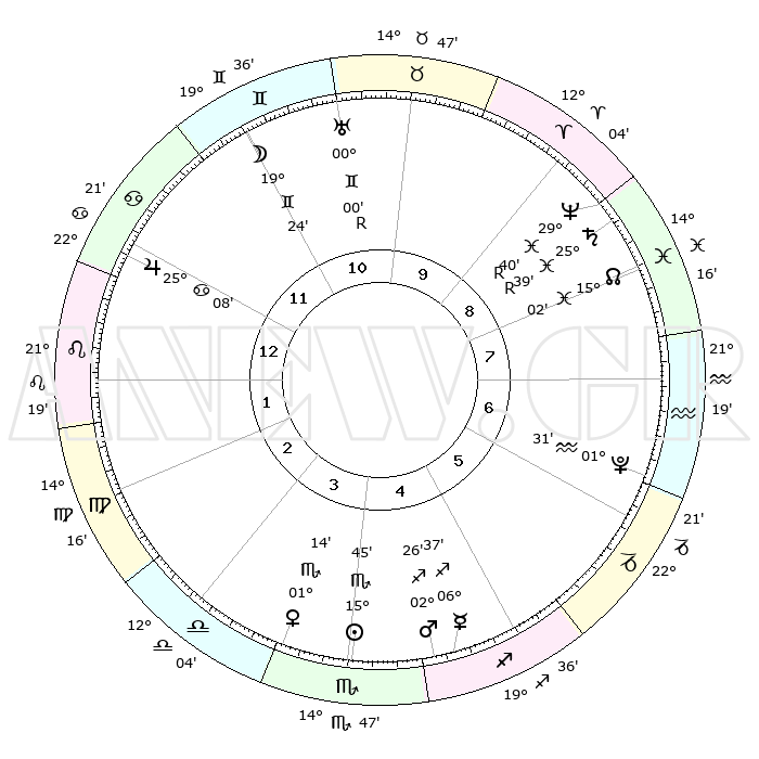| | ΘΕΣΕΙΣ ΠΛΑΝΗΤΩΝ ΑΣΤΡΟΛΟΓΙΚΟΥ ΧΑΡΤΗ ΤΗΣ ΣΤΙΓΜΗΣ ΑΥΤΗΣ | | | | Πλανήτης | Ζώδιο | Μοίρες | Δεκαήμ. | Σε οίκο | Απόκλιση | | Ακμές των οίκων | | Ηλιος | Σκορπιός | 15°34' | Δεύτερο | 5 | 16 S 30 | | 1ος | 24°30' | Δίδυμοι | | Σελήνη | Δίδυμοι | 16°35' | Δεύτερο | 12 | 27 N 48 | | 2ος | 15°42' | Καρκίνος | | Ερμής | Τοξότης | 06°34' | Πρώτο | 6 | 23 S 58 | | 3ος | 07°12' | Λέων | | Αφροδίτη | Σκορπιός | 00°60' | Πρώτο | 5 | 10 S 32 | | 4ος | 02°40' | Παρθένος | | Αρης | Τοξότης | 02°18' | Πρώτο | 6 | 21 S 04 | | 5ος | 05°41' | Ζυγός | | Δίας | Καρκίνος | 25°08' | Τρίτο | 2 | 21 N 12 | | 6ος | 15°57' | Σκορπιός | | Κρόνος | Ιχθείς | 25°39'R | Τρίτο | 10 | 03 S 58 | | 7ος | 24°30' | Τοξότης | | Ουρανός | Δίδυμοι | 00°01'R | Πρώτο | 12 | 19 N 57 | | 8ος | 15°42' | Αιγόκερως | | Ποσειδώνας | Ιχθείς | 29°40'R | Τρίτο | 10 | 01 S 23 | | 9ος | 07°12' | Υδροχόος | | Πλούτωνας | Υδροχόος | 01°31' | Πρώτο | 8 | 23 S 30 | | 10ος | 02°40' | Ιχθείς | | Β. Δεσμός | Ιχθείς | 15°03' | Δεύτερο | 10 | 05 S 53 | | 11ος | 05°41' | Κριός | | Ωροσκόπος | Δίδυμοι | 24°30' | Τρίτο | | | 12ος | 15°57' | Ταύρος | | Μεσουράνημα | Ιχθείς | 02°40' | Πρώτο | | | |
