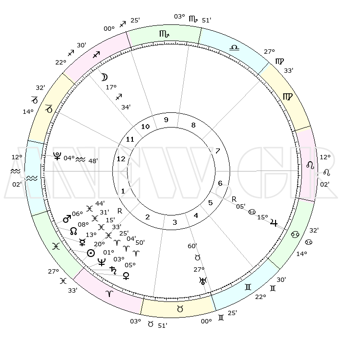 | | ΘΕΣΕΙΣ ΠΛΑΝΗΤΩΝ ΑΣΤΡΟΛΟΓΙΚΟΥ ΧΑΡΤΗ ΤΗΣ ΣΤΙΓΜΗΣ ΑΥΤΗΣ | | | | Πλανήτης | Ζώδιο | Μοίρες | Δεκαήμ. | Σε οίκο | Απόκλιση | | Ακμές των οίκων | | Ηλιος | Ιχθείς | 20°30' | Τρίτο | 2 | 03 S 46 | | 1ος | 16°49' | Αιγόκερως | | Σελήνη | Τοξότης | 16°51' | Δεύτερο | 11 | 27 S 59 | | 2ος | 28°12' | Υδροχόος | | Ερμής | Ιχθείς | 13°18'R | Δεύτερο | 2 | 03 S 35 | | 3ος | 08°12' | Κριός | | Αφροδίτη | Κριός | 05°45' | Πρώτο | 2 | 01 N 14 | | 4ος | 09°05' | Ταύρος | | Αρης | Ιχθείς | 06°41' | Πρώτο | 2 | 10 S 04 | | 5ος | 03°05' | Δίδυμοι | | Δίας | Καρκίνος | 15°05'R | Δεύτερο | 6 | 22 N 56 | | 6ος | 24°18' | Δίδυμοι | | Κρόνος | Κριός | 03°03' | Πρώτο | 2 | 00 S 44 | | 7ος | 16°49' | Καρκίνος | | Ουρανός | Ταύρος | 27°59' | Τρίτο | 4 | 19 N 32 | | 8ος | 28°12' | Λέων | | Ποσειδώνας | Κριός | 01°25' | Πρώτο | 2 | 00 S 38 | | 9ος | 08°12' | Ζυγός | | Πλούτωνας | Υδροχόος | 04°48' | Πρώτο | 1 | 22 S 50 | | 10ος | 09°05' | Σκορπιός | | Β. Δεσμός | Ιχθείς | 08°31' | Πρώτο | 2 | 08 S 23 | | 11ος | 03°05' | Τοξότης | | Ωροσκόπος | Αιγόκερως | 16°49' | Δεύτερο | | | 12ος | 24°18' | Τοξότης | | Μεσουράνημα | Σκορπιός | 09°05' | Πρώτο | | | |