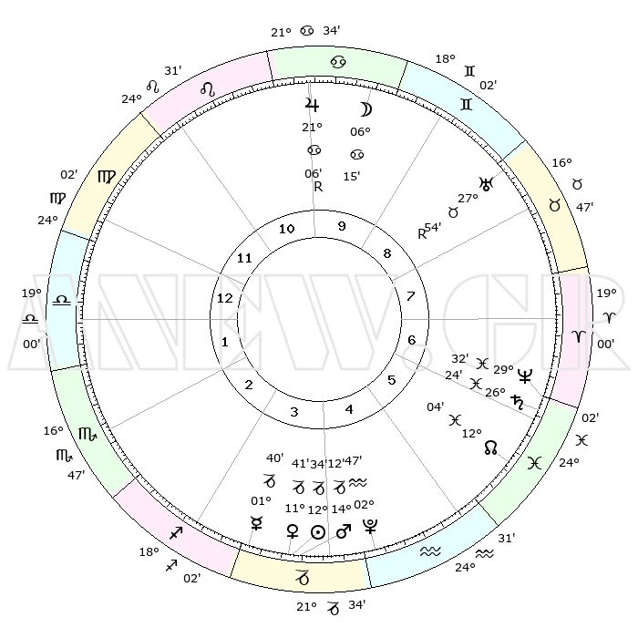 | | ΘΕΣΕΙΣ ΠΛΑΝΗΤΩΝ ΑΣΤΡΟΛΟΓΙΚΟΥ ΧΑΡΤΗ ΤΗΣ ΣΤΙΓΜΗΣ ΑΥΤΗΣ | | | | Πλανήτης | Ζώδιο | Μοίρες | Δεκαήμ. | Σε οίκο | Απόκλιση | | Ακμές των οίκων | | Ηλιος | Αιγόκερως | 12°29' | Δεύτερο | 4 | 22 S 51 | | 1ος | 25°42' | Παρθένος | | Σελήνη | Καρκίνος | 05°04' | Πρώτο | 10 | 27 N 57 | | 2ος | 21°57' | Ζυγός | | Ερμής | Αιγόκερως | 01°33' | Πρώτο | 4 | 24 S 12 | | 3ος | 22°13' | Σκορπιός | | Αφροδίτη | Αιγόκερως | 11°35' | Δεύτερο | 4 | 23 S 30 | | 4ος | 25°10' | Τοξότης | | Αρης | Αιγόκερως | 14°09' | Δεύτερο | 4 | 23 S 35 | | 5ος | 28°12' | Αιγόκερως | | Δίας | Καρκίνος | 21°06'R | Τρίτο | 10 | 22 N 01 | | 6ος | 28°48' | Υδροχόος | | Κρόνος | Ιχθείς | 26°24' | Τρίτο | 7 | 03 S 30 | | 7ος | 25°42' | Ιχθείς | | Ουρανός | Ταύρος | 27°54'R | Τρίτο | 9 | 19 N 30 | | 8ος | 21°57' | Κριός | | Ποσειδώνας | Ιχθείς | 29°32' | Τρίτο | 7 | 01 S 24 | | 9ος | 22°13' | Ταύρος | | Πλούτωνας | Υδροχόος | 02°47' | Πρώτο | 5 | 23 S 12 | | 10ος | 25°10' | Δίδυμοι | | Β. Δεσμός | Ιχθείς | 12°04' | Δεύτερο | 6 | 07 S 02 | | 11ος | 28°12' | Καρκίνος | | Ωροσκόπος | Παρθένος | 25°42' | Τρίτο | | | 12ος | 28°48' | Λέων | | Μεσουράνημα | Δίδυμοι | 25°10' | Τρίτο | | | |