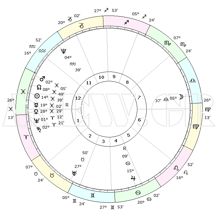 | | ΘΕΣΕΙΣ ΠΛΑΝΗΤΩΝ ΑΣΤΡΟΛΟΓΙΚΟΥ ΧΑΡΤΗ ΤΗΣ ΣΤΙΓΜΗΣ ΑΥΤΗΣ | | | | Πλανήτης | Ζώδιο | Μοίρες | Δεκαήμ. | Σε οίκο | Απόκλιση | | Ακμές των οίκων | | Ηλιος | Ιχθείς | 14°35' | Δεύτερο | 1 | 06 S 04 | | 1ος | 20°40' | Υδροχόος | | Σελήνη | Ζυγός | 04°48' | Πρώτο | 7 | 04 S 01 | | 2ος | 06°29' | Κριός | | Ερμής | Ιχθείς | 19°06'R | Δεύτερο | 1 | 00 S 56 | | 3ος | 11°04' | Ταύρος | | Αφροδίτη | Ιχθείς | 28°24' | Τρίτο | 1 | 01 S 49 | | 4ος | 06°29' | Δίδυμοι | | Αρης | Ιχθείς | 02°02' | Πρώτο | 1 | 11 S 46 | | 5ος | 28°17' | Δίδυμοι | | Δίας | Καρκίνος | 15°09'R | Δεύτερο | 5 | 22 N 55 | | 6ος | 20°58' | Καρκίνος | | Κρόνος | Κριός | 02°20' | Πρώτο | 1 | 01 S 01 | | 7ος | 20°40' | Λέων | | Ουρανός | Ταύρος | 27°50' | Τρίτο | 3 | 19 N 30 | | 8ος | 06°29' | Ζυγός | | Ποσειδώνας | Κριός | 01°12' | Πρώτο | 1 | 00 S 43 | | 9ος | 11°04' | Σκορπιός | | Πλούτωνας | Υδροχόος | 04°39' | Πρώτο | 12 | 22 S 51 | | 10ος | 06°29' | Τοξότης | | Β. Δεσμός | Ιχθείς | 08°49' | Πρώτο | 1 | 08 S 16 | | 11ος | 28°17' | Τοξότης | | Ωροσκόπος | Υδροχόος | 20°40' | Τρίτο | | | 12ος | 20°58' | Αιγόκερως | | Μεσουράνημα | Τοξότης | 06°29' | Πρώτο | | | |