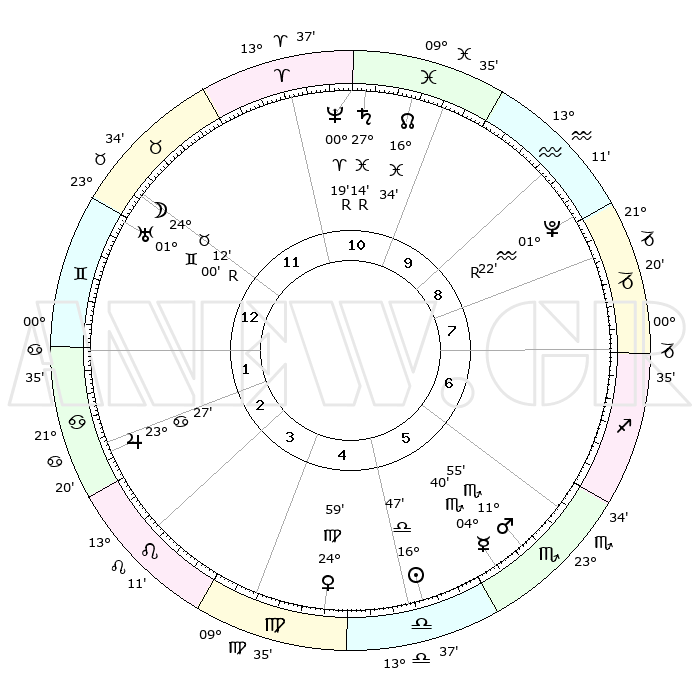 | ΘΕΣΕΙΣ ΠΛΑΝΗΤΩΝ ΑΣΤΡΟΛΟΓΙΚΟΥ ΧΑΡΤΗ ΤΗΣ ΣΤΙΓΜΗΣ ΑΥΤΗΣ | | Πλανήτης | Ζώδιο | Μοίρες | Δεκαήμ. | Σε οίκο | Απόκλιση | | Ακμές των οίκων | Ηλιος | Ζυγός | 16°35' | Δεύτερο | 7 | 06 S 31 | | 1ος | 00°44' | Κριός | Σελήνη | Ταύρος | 21°16' | Τρίτο | 2 | 22 N 33 | | 2ος | 10°51' | Ταύρος | Ερμής | Σκορπιός | 04°23' | Πρώτο | 7 | 14 S 03 | | 3ος | 08°09' | Δίδυμοι | Αφροδίτη | Παρθένος | 24°44' | Τρίτο | 6 | 03 N 25 | | 4ος | 00°25' | Καρκίνος | Αρης | Σκορπιός | 11°47' | Δεύτερο | 8 | 15 S 32 | | 5ος | 22°45' | Καρκίνος | Δίας | Καρκίνος | 23°26' | Τρίτο | 5 | 21 N 26 | | 6ος | 20°16' | Λέων | Κρόνος | Ιχθείς | 27°15'R | Τρίτο | 12 | 03 S 24 | | 7ος | 00°44' | Ζυγός | Ουρανός | Δίδυμοι | 01°00'R | Πρώτο | 2 | 20 N 09 | | 8ος | 10°51' | Σκορπιός | Ποσειδώνας | Κριός | 00°19'R | Πρώτο | 12 | 01 S 08 | | 9ος | 08°09' | Τοξότης | Πλούτωνας | Υδροχόος | 01°22'R | Πρώτο | 11 | 23 S 32 | | 10ος | 00°25' | Αιγόκερως | Β. Δεσμός | Ιχθείς | 16°35' | Δεύτερο | 12 | 05 S 18 | | 11ος | 22°45' | Αιγόκερως | Ωροσκόπος | Κριός | 00°44' | Πρώτο | | | 12ος | 20°16' | Υδροχόος | Μεσουράνημα | Αιγόκερως | 00°25' | Πρώτο | | | |
