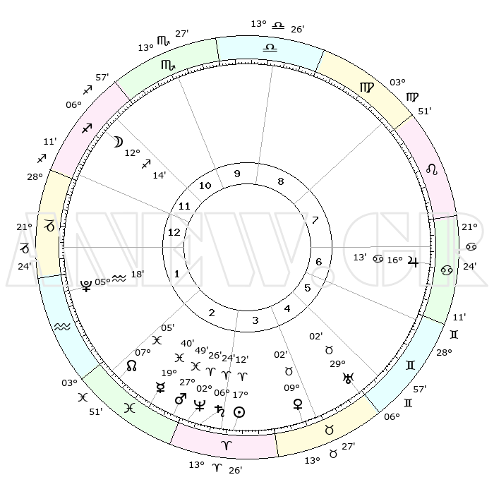 | | ΘΕΣΕΙΣ ΠΛΑΝΗΤΩΝ ΑΣΤΡΟΛΟΓΙΚΟΥ ΧΑΡΤΗ ΤΗΣ ΣΤΙΓΜΗΣ ΑΥΤΗΣ | | | | Πλανήτης | Ζώδιο | Μοίρες | Δεκαήμ. | Σε οίκο | Απόκλιση | | Ακμές των οίκων | | Ηλιος | Κριός | 17°08' | Δεύτερο | 3 | 06 N 44 | | 1ος | 29°02' | Τοξότης | | Σελήνη | Τοξότης | 11°30' | Δεύτερο | 12 | 27 S 16 | | 2ος | 05°57' | Υδροχόος | | Ερμής | Ιχθείς | 19°36' | Δεύτερο | 3 | 06 S 01 | | 3ος | 15°53' | Ιχθείς | | Αφροδίτη | Ταύρος | 08°58' | Πρώτο | 4 | 14 N 18 | | 4ος | 19°58' | Κριός | | Αρης | Ιχθείς | 27°46' | Τρίτο | 3 | 01 S 49 | | 5ος | 16°26' | Ταύρος | | Δίας | Καρκίνος | 16°13' | Δεύτερο | 7 | 22 N 49 | | 6ος | 08°18' | Δίδυμοι | | Κρόνος | Κριός | 06°24' | Πρώτο | 3 | 00 N 35 | | 7ος | 29°02' | Δίδυμοι | | Ουρανός | Ταύρος | 29°02' | Τρίτο | 5 | 19 N 46 | | 8ος | 05°57' | Λέων | | Ποσειδώνας | Κριός | 02°26' | Πρώτο | 3 | 00 S 14 | | 9ος | 15°53' | Παρθένος | | Πλούτωνας | Υδροχόος | 05°18' | Πρώτο | 1 | 22 S 47 | | 10ος | 19°58' | Ζυγός | | Β. Δεσμός | Ιχθείς | 07°05' | Πρώτο | 2 | 08 S 54 | | 11ος | 16°26' | Σκορπιός | | Ωροσκόπος | Τοξότης | 29°02' | Τρίτο | | | 12ος | 08°18' | Τοξότης | | Μεσουράνημα | Ζυγός | 19°58' | Δεύτερο | | | |