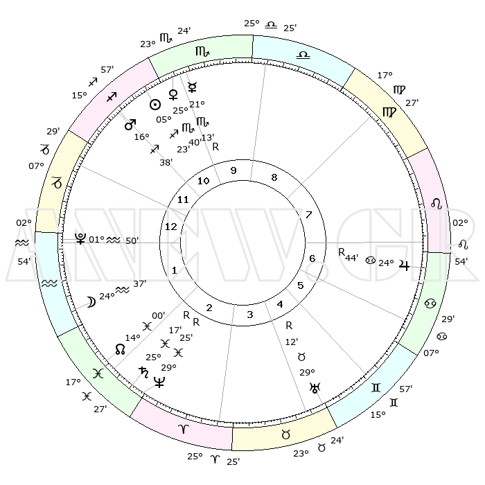 | | ΘΕΣΕΙΣ ΠΛΑΝΗΤΩΝ ΑΣΤΡΟΛΟΓΙΚΟΥ ΧΑΡΤΗ ΤΗΣ ΣΤΙΓΜΗΣ ΑΥΤΗΣ | | | | Πλανήτης | Ζώδιο | Μοίρες | Δεκαήμ. | Σε οίκο | Απόκλιση | | Ακμές των οίκων | | Ηλιος | Τοξότης | 05°21' | Πρώτο | 10 | 21 S 11 | | 1ος | 21°07' | Αιγόκερως | | Σελήνη | Υδροχόος | 24°16' | Τρίτο | 1 | 15 S 04 | | 2ος | 03°30' | Ιχθείς | | Ερμής | Σκορπιός | 21°14'R | Τρίτο | 10 | 15 S 50 | | 3ος | 13°07' | Κριός | | Αφροδίτη | Σκορπιός | 25°38' | Τρίτο | 10 | 18 S 21 | | 4ος | 13°11' | Ταύρος | | Αρης | Τοξότης | 16°37' | Δεύτερο | 11 | 23 S 23 | | 5ος | 06°43' | Δίδυμοι | | Δίας | Καρκίνος | 24°44'R | Τρίτο | 7 | 21 N 19 | | 6ος | 27°56' | Δίδυμοι | | Κρόνος | Ιχθείς | 25°17'R | Τρίτο | 2 | 04 S 04 | | 7ος | 21°07' | Καρκίνος | | Ουρανός | Ταύρος | 29°12'R | Τρίτο | 4 | 19 N 46 | | 8ος | 03°30' | Παρθένος | | Ποσειδώνας | Ιχθείς | 29°25'R | Τρίτο | 2 | 01 S 28 | | 9ος | 13°07' | Ζυγός | | Πλούτωνας | Υδροχόος | 01°50' | Πρώτο | 1 | 23 S 25 | | 10ος | 13°11' | Σκορπιός | | Β. Δεσμός | Ιχθείς | 14°00' | Δεύτερο | 2 | 06 S 18 | | 11ος | 06°43' | Τοξότης | | Ωροσκόπος | Αιγόκερως | 21°07' | Τρίτο | | | 12ος | 27°56' | Τοξότης | | Μεσουράνημα | Σκορπιός | 13°11' | Δεύτερο | | | |