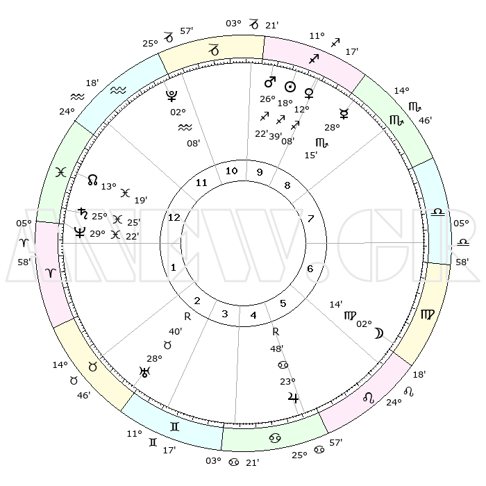 | | ΘΕΣΕΙΣ ΠΛΑΝΗΤΩΝ ΑΣΤΡΟΛΟΓΙΚΟΥ ΧΑΡΤΗ ΤΗΣ ΣΤΙΓΜΗΣ ΑΥΤΗΣ | | | | Πλανήτης | Ζώδιο | Μοίρες | Δεκαήμ. | Σε οίκο | Απόκλιση | | Ακμές των οίκων | | Ηλιος | Τοξότης | 18°37' | Δεύτερο | 9 | 22 S 57 | | 1ος | 10°25' | Ιχθείς | | Σελήνη | Παρθένος | 01°39' | Πρώτο | 6 | 11 N 49 | | 2ος | 24°38' | Κριός | | Ερμής | Σκορπιός | 28°12' | Τρίτο | 9 | 17 S 44 | | 3ος | 25°21' | Ταύρος | | Αφροδίτη | Τοξότης | 12°04' | Δεύτερο | 9 | 21 S 53 | | 4ος | 18°50' | Δίδυμοι | | Αρης | Τοξότης | 26°20' | Τρίτο | 10 | 24 S 07 | | 5ος | 10°35' | Καρκίνος | | Δίας | Καρκίνος | 23°48'R | Τρίτο | 5 | 21 N 31 | | 6ος | 05°18' | Λέων | | Κρόνος | Ιχθείς | 25°25' | Τρίτο | 1 | 03 S 58 | | 7ος | 10°25' | Παρθένος | | Ουρανός | Ταύρος | 28°40'R | Τρίτο | 3 | 19 N 40 | | 8ος | 24°38' | Ζυγός | | Ποσειδώνας | Ιχθείς | 29°22'R | Τρίτο | 1 | 01 S 29 | | 9ος | 25°21' | Σκορπιός | | Πλούτωνας | Υδροχόος | 02°08' | Πρώτο | 11 | 23 S 21 | | 10ος | 18°50' | Τοξότης | | Β. Δεσμός | Ιχθείς | 13°19' | Δεύτερο | 1 | 06 S 33 | | 11ος | 10°34' | Αιγόκερως | | Ωροσκόπος | Ιχθείς | 10°25' | Δεύτερο | | | 12ος | 05°18' | Υδροχόος | | Μεσουράνημα | Τοξότης | 18°50' | Δεύτερο | | | |