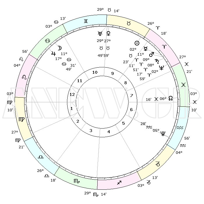 | | ΘΕΣΕΙΣ ΠΛΑΝΗΤΩΝ ΑΣΤΡΟΛΟΓΙΚΟΥ ΧΑΡΤΗ ΤΗΣ ΣΤΙΓΜΗΣ ΑΥΤΗΣ | | | | Πλανήτης | Ζώδιο | Μοίρες | Δεκαήμ. | Σε οίκο | Απόκλιση | | Ακμές των οίκων | | Ηλιος | Ταύρος | 02°20' | Πρώτο | 9 | 12 N 17 | | 1ος | 15°38' | Λέων | | Σελήνη | Καρκίνος | 10°39' | Δεύτερο | 11 | 27 N 16 | | 2ος | 07°60' | Παρθένος | | Ερμής | Κριός | 11°05' | Δεύτερο | 9 | 02 N 02 | | 3ος | 05°07' | Ζυγός | | Αφροδίτη | Ταύρος | 27°55' | Τρίτο | 10 | 20 N 11 | | 4ος | 07°34' | Σκορπιός | | Αρης | Κριός | 09°48' | Πρώτο | 9 | 03 N 01 | | 5ος | 12°48' | Τοξότης | | Δίας | Καρκίνος | 17°48' | Δεύτερο | 12 | 22 N 38 | | 6ος | 16°13' | Αιγόκερως | | Κρόνος | Κριός | 08°16' | Πρώτο | 9 | 01 N 18 | | 7ος | 15°38' | Υδροχόος | | Ουρανός | Ταύρος | 29°49' | Τρίτο | 10 | 19 N 57 | | 8ος | 07°60' | Ιχθείς | | Ποσειδώνας | Κριός | 02°59' | Πρώτο | 8 | 00 S 01 | | 9ος | 05°07' | Κριός | | Πλούτωνας | Υδροχόος | 05°28' | Πρώτο | 6 | 22 S 48 | | 10ος | 07°35' | Ταύρος | | Β. Δεσμός | Ιχθείς | 06°16' | Πρώτο | 7 | 09 S 13 | | 11ος | 12°48' | Δίδυμοι | | Ωροσκόπος | Λέων | 15°38' | Δεύτερο | | | 12ος | 16°13' | Καρκίνος | | Μεσουράνημα | Ταύρος | 07°35' | Πρώτο | | | |