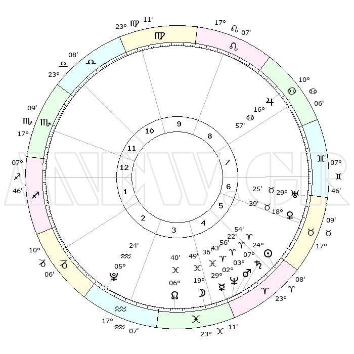 | | ΘΕΣΕΙΣ ΠΛΑΝΗΤΩΝ ΑΣΤΡΟΛΟΓΙΚΟΥ ΧΑΡΤΗ ΤΗΣ ΣΤΙΓΜΗΣ ΑΥΤΗΣ | | | | Πλανήτης | Ζώδιο | Μοίρες | Δεκαήμ. | Σε οίκο | Απόκλιση | | Ακμές των οίκων | | Ηλιος | Κριός | 24°47' | Τρίτο | 6 | 09 N 36 | | 1ος | 03°24' | Σκορπιός | | Σελήνη | Ιχθείς | 18°12' | Δεύτερο | 5 | 03 S 50 | | 2ος | 02°01' | Τοξότης | | Ερμής | Ιχθείς | 29°27' | Τρίτο | 5 | 02 S 36 | | 3ος | 04°16' | Αιγόκερως | | Αφροδίτη | Ταύρος | 18°30' | Δεύτερο | 7 | 17 N 29 | | 4ος | 08°41' | Υδροχόος | | Αρης | Κριός | 03°50' | Πρώτο | 5 | 00 N 37 | | 5ος | 11°33' | Ιχθείς | | Δίας | Καρκίνος | 16°56' | Δεύτερο | 9 | 22 N 44 | | 6ος | 09°54' | Κριός | | Κρόνος | Κριός | 07°21' | Πρώτο | 5 | 00 N 57 | | 7ος | 03°24' | Ταύρος | | Ουρανός | Ταύρος | 29°25' | Τρίτο | 7 | 19 N 51 | | 8ος | 02°01' | Δίδυμοι | | Ποσειδώνας | Κριός | 02°43' | Πρώτο | 5 | 00 S 08 | | 9ος | 04°16' | Καρκίνος | | Πλούτωνας | Υδροχόος | 05°24' | Πρώτο | 3 | 22 S 47 | | 10ος | 08°41' | Λέων | | Β. Δεσμός | Ιχθείς | 06°41' | Πρώτο | 4 | 09 S 04 | | 11ος | 11°33' | Παρθένος | | Ωροσκόπος | Σκορπιός | 03°24' | Πρώτο | | | 12ος | 09°54' | Ζυγός | | Μεσουράνημα | Λέων | 08°41' | Πρώτο | | | |