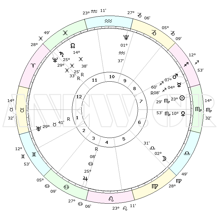 | | ΘΕΣΕΙΣ ΠΛΑΝΗΤΩΝ ΑΣΤΡΟΛΟΓΙΚΟΥ ΧΑΡΤΗ ΤΗΣ ΣΤΙΓΜΗΣ ΑΥΤΗΣ | | | | Πλανήτης | Ζώδιο | Μοίρες | Δεκαήμ. | Σε οίκο | Απόκλιση | | Ακμές των οίκων | | Ηλιος | Σκορπιός | 23°26' | Τρίτο | 8 | 18 S 38 | | 1ος | 17°09' | Κριός | | Σελήνη | Ζυγός | 01°53' | Πρώτο | 6 | 02 S 01 | | 2ος | 22°57' | Ταύρος | | Ερμής | Τοξότης | 04°11'R | Πρώτο | 8 | 22 S 01 | | 3ος | 17°58' | Δίδυμοι | | Αφροδίτη | Σκορπιός | 10°49' | Δεύτερο | 7 | 13 S 56 | | 4ος | 09°45' | Καρκίνος | | Αρης | Τοξότης | 07°58' | Πρώτο | 8 | 22 S 09 | | 5ος | 03°03' | Λέων | | Δίας | Καρκίνος | 25°08'R | Τρίτο | 4 | 21 N 13 | | 6ος | 03°19' | Παρθένος | | Κρόνος | Ιχθείς | 25°26'R | Τρίτο | 12 | 04 S 03 | | 7ος | 17°09' | Ζυγός | | Ουρανός | Ταύρος | 29°41'R | Τρίτο | 2 | 19 N 53 | | 8ος | 22°57' | Σκορπιός | | Ποσειδώνας | Ιχθείς | 29°33'R | Τρίτο | 12 | 01 S 26 | | 9ος | 17°58' | Τοξότης | | Πλούτωνας | Υδροχόος | 01°37' | Πρώτο | 10 | 23 S 28 | | 10ος | 09°45' | Αιγόκερως | | Β. Δεσμός | Ιχθείς | 14°38' | Δεύτερο | 12 | 06 S 03 | | 11ος | 03°03' | Υδροχόος | | Ωροσκόπος | Κριός | 17°09' | Δεύτερο | | | 12ος | 03°19' | Ιχθείς | | Μεσουράνημα | Αιγόκερως | 09°45' | Πρώτο | | | |