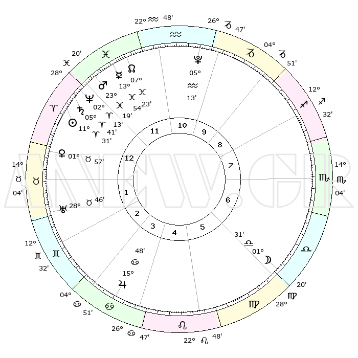 | | ΘΕΣΕΙΣ ΠΛΑΝΗΤΩΝ ΑΣΤΡΟΛΟΓΙΚΟΥ ΧΑΡΤΗ ΤΗΣ ΣΤΙΓΜΗΣ ΑΥΤΗΣ | | | | Πλανήτης | Ζώδιο | Μοίρες | Δεκαήμ. | Σε οίκο | Απόκλιση | | Ακμές των οίκων | | Ηλιος | Κριός | 11°28' | Δεύτερο | 12 | 04 N 32 | | 1ος | 12°13' | Κριός | | Σελήνη | Ζυγός | 00°46' | Πρώτο | 6 | 02 S 06 | | 2ος | 19°21' | Ταύρος | | Ερμής | Ιχθείς | 13°51' | Δεύτερο | 12 | 07 S 35 | | 3ος | 15°01' | Δίδυμοι | | Αφροδίτη | Ταύρος | 01°52' | Πρώτο | 1 | 11 N 43 | | 4ος | 06°54' | Καρκίνος | | Αρης | Ιχθείς | 23°16' | Τρίτο | 12 | 03 S 38 | | 5ος | 29°51' | Καρκίνος | | Δίας | Καρκίνος | 15°48' | Δεύτερο | 4 | 22 N 52 | | 6ος | 29°15' | Λέων | | Κρόνος | Κριός | 05°41' | Πρώτο | 12 | 00 N 18 | | 7ος | 12°13' | Ζυγός | | Ουρανός | Ταύρος | 28°46' | Τρίτο | 2 | 19 N 43 | | 8ος | 19°21' | Σκορπιός | | Ποσειδώνας | Κριός | 02°13' | Πρώτο | 12 | 00 S 19 | | 9ος | 15°01' | Τοξότης | | Πλούτωνας | Υδροχόος | 05°13' | Πρώτο | 11 | 22 S 47 | | 10ος | 06°54' | Αιγόκερως | | Β. Δεσμός | Ιχθείς | 07°24' | Πρώτο | 12 | 08 S 48 | | 11ος | 29°51' | Αιγόκερως | | Ωροσκόπος | Κριός | 12°13' | Δεύτερο | | | 12ος | 29°15' | Υδροχόος | | Μεσουράνημα | Αιγόκερως | 06°54' | Πρώτο | | | |