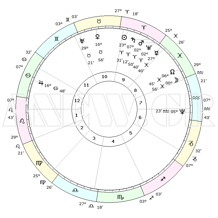 | | ΘΕΣΕΙΣ ΠΛΑΝΗΤΩΝ ΑΣΤΡΟΛΟΓΙΚΟΥ ΧΑΡΤΗ ΤΗΣ ΣΤΙΓΜΗΣ ΑΥΤΗΣ | | | | Πλανήτης | Ζώδιο | Μοίρες | Δεκαήμ. | Σε οίκο | Απόκλιση | | Ακμές των οίκων | | Ηλιος | Κριός | 23°28' | Τρίτο | 10 | 09 N 07 | | 1ος | 20°48' | Καρκίνος | | Σελήνη | Ιχθείς | 00°10' | Πρώτο | 8 | 12 S 05 | | 2ος | 11°22' | Λέων | | Ερμής | Ιχθείς | 27°36' | Τρίτο | 9 | 03 S 17 | | 3ος | 05°12' | Παρθένος | | Αφροδίτη | Ταύρος | 16°51' | Δεύτερο | 11 | 16 N 58 | | 4ος | 04°57' | Ζυγός | | Αρης | Κριός | 02°47' | Πρώτο | 9 | 00 N 12 | | 5ος | 10°58' | Σκορπιός | | Δίας | Καρκίνος | 16°48' | Δεύτερο | 12 | 22 N 45 | | 6ος | 18°13' | Τοξότης | | Κρόνος | Κριός | 07°11' | Πρώτο | 10 | 00 N 53 | | 7ος | 20°48' | Αιγόκερως | | Ουρανός | Ταύρος | 29°21' | Τρίτο | 11 | 19 N 50 | | 8ος | 11°22' | Υδροχόος | | Ποσειδώνας | Κριός | 02°40' | Πρώτο | 9 | 00 S 09 | | 9ος | 05°12' | Ιχθείς | | Πλούτωνας | Υδροχόος | 05°23' | Πρώτο | 7 | 22 S 47 | | 10ος | 04°57' | Κριός | | Β. Δεσμός | Ιχθείς | 06°45' | Πρώτο | 9 | 09 S 02 | | 11ος | 10°58' | Ταύρος | | Ωροσκόπος | Καρκίνος | 20°48' | Τρίτο | | | 12ος | 18°13' | Δίδυμοι | | Μεσουράνημα | Κριός | 04°57' | Πρώτο | | | |