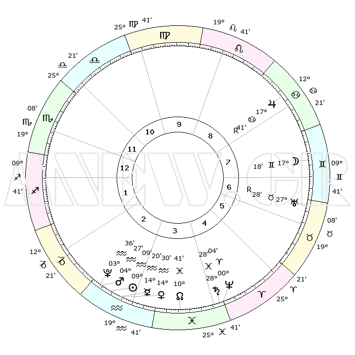 | | ΘΕΣΕΙΣ ΠΛΑΝΗΤΩΝ ΑΣΤΡΟΛΟΓΙΚΟΥ ΧΑΡΤΗ ΤΗΣ ΣΤΙΓΜΗΣ ΑΥΤΗΣ | | | | Πλανήτης | Ζώδιο | Μοίρες | Δεκαήμ. | Σε οίκο | Απόκλιση | | Ακμές των οίκων | | Ηλιος | Υδροχόος | 09°05' | Πρώτο | 3 | 17 S 59 | | 1ος | 19°44' | Σκορπιός | | Σελήνη | Δίδυμοι | 16°19' | Δεύτερο | 7 | 27 N 52 | | 2ος | 19°39' | Τοξότης | | Ερμής | Υδροχόος | 14°13' | Δεύτερο | 3 | 18 S 30 | | 3ος | 23°46' | Αιγόκερως | | Αφροδίτη | Υδροχόος | 14°25' | Δεύτερο | 3 | 17 S 45 | | 4ος | 29°21' | Υδροχόος | | Αρης | Υδροχόος | 04°23' | Πρώτο | 3 | 20 S 10 | | 5ος | 01°26' | Κριός | | Δίας | Καρκίνος | 17°42'R | Δεύτερο | 8 | 22 N 34 | | 6ος | 27°52' | Κριός | | Κρόνος | Ιχθείς | 28°28' | Τρίτο | 4 | 02 S 37 | | 7ος | 19°44' | Ταύρος | | Ουρανός | Ταύρος | 27°28'R | Τρίτο | 7 | 19 N 24 | | 8ος | 19°39' | Δίδυμοι | | Ποσειδώνας | Κριός | 00°04' | Πρώτο | 4 | 01 S 11 | | 9ος | 23°46' | Καρκίνος | | Πλούτωνας | Υδροχόος | 03°36' | Πρώτο | 3 | 23 S 02 | | 10ος | 29°21' | Λέων | | Β. Δεσμός | Ιχθείς | 10°41' | Δεύτερο | 4 | 07 S 33 | | 11ος | 01°26' | Ζυγός | | Ωροσκόπος | Σκορπιός | 19°44' | Δεύτερο | | | 12ος | 27°52' | Ζυγός | | Μεσουράνημα | Λέων | 29°21' | Τρίτο | | | |