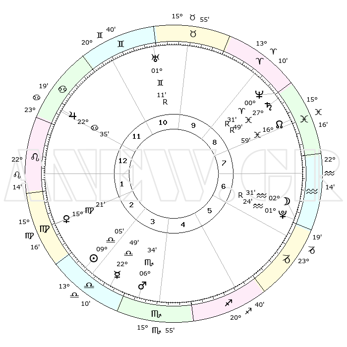 | ΘΕΣΕΙΣ ΠΛΑΝΗΤΩΝ ΑΣΤΡΟΛΟΓΙΚΟΥ ΧΑΡΤΗ ΤΗΣ ΣΤΙΓΜΗΣ ΑΥΤΗΣ | | Πλανήτης | Ζώδιο | Μοίρες | Δεκαήμ. | Σε οίκο | Απόκλιση | | Ακμές των οίκων | Ηλιος | Ζυγός | 09°01' | Πρώτο | 3 | 03 S 34 | | 1ος | 03°31' | Λέων | Σελήνη | Υδροχόος | 01°42' | Πρώτο | 6 | 23 S 30 | | 2ος | 24°49' | Λέων | Ερμής | Ζυγός | 22°43' | Τρίτο | 4 | 09 S 02 | | 3ος | 20°20' | Παρθένος | Αφροδίτη | Παρθένος | 15°16' | Δεύτερο | 2 | 07 N 01 | | 4ος | 21°47' | Ζυγός | Αρης | Σκορπιός | 06°32' | Πρώτο | 4 | 13 S 47 | | 5ος | 27°43' | Σκορπιός | Δίας | Καρκίνος | 22°35' | Τρίτο | 12 | 21 N 34 | | 6ος | 02°51' | Αιγόκερως | Κρόνος | Ιχθείς | 27°49'R | Τρίτο | 9 | 03 S 10 | | 7ος | 03°31' | Υδροχόος | Ουρανός | Δίδυμοι | 01°11'R | Πρώτο | 11 | 20 N 11 | | 8ος | 24°49' | Υδροχόος | Ποσειδώνας | Κριός | 00°31'R | Πρώτο | 9 | 01 S 03 | | 9ος | 20°20' | Ιχθείς | Πλούτωνας | Υδροχόος | 01°24'R | Πρώτο | 6 | 23 S 32 | | 10ος | 21°47' | Κριός | Β. Δεσμός | Ιχθείς | 16°59' | Δεύτερο | 8 | 05 S 08 | | 11ος | 27°43' | Ταύρος | Ωροσκόπος | Λέων | 03°31' | Πρώτο | | | 12ος | 02°51' | Καρκίνος | Μεσουράνημα | Κριός | 21°47' | Τρίτο | | | |