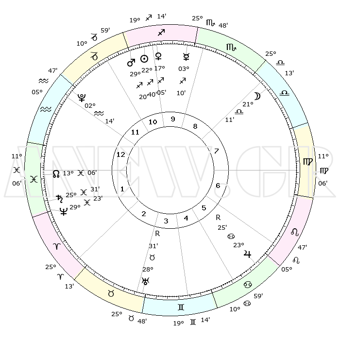 | | ΘΕΣΕΙΣ ΠΛΑΝΗΤΩΝ ΑΣΤΡΟΛΟΓΙΚΟΥ ΧΑΡΤΗ ΤΗΣ ΣΤΙΓΜΗΣ ΑΥΤΗΣ | | | | Πλανήτης | Ζώδιο | Μοίρες | Δεκαήμ. | Σε οίκο | Απόκλιση | | Ακμές των οίκων | | Ηλιος | Τοξότης | 22°26' | Τρίτο | 1 | 23 S 13 | | 1ος | 10°57' | Τοξότης | | Σελήνη | Ζυγός | 18°30' | Δεύτερο | 10 | 09 S 57 | | 2ος | 13°51' | Αιγόκερως | | Ερμής | Τοξότης | 02°52' | Πρώτο | 12 | 19 S 07 | | 3ος | 21°24' | Υδροχόος | | Αφροδίτη | Τοξότης | 16°49' | Δεύτερο | 1 | 22 S 35 | | 4ος | 27°21' | Ιχθείς | | Αρης | Τοξότης | 29°10' | Τρίτο | 1 | 24 S 12 | | 5ος | 26°49' | Κριός | | Δίας | Καρκίνος | 23°27'R | Τρίτο | 8 | 21 N 35 | | 6ος | 20°27' | Ταύρος | | Κρόνος | Ιχθείς | 25°31' | Τρίτο | 3 | 03 S 55 | | 7ος | 10°57' | Δίδυμοι | | Ουρανός | Ταύρος | 28°32'R | Τρίτο | 6 | 19 N 38 | | 8ος | 13°51' | Καρκίνος | | Ποσειδώνας | Ιχθείς | 29°23' | Τρίτο | 4 | 01 S 29 | | 9ος | 21°24' | Λέων | | Πλούτωνας | Υδροχόος | 02°13' | Πρώτο | 2 | 23 S 20 | | 10ος | 27°21' | Παρθένος | | Β. Δεσμός | Ιχθείς | 13°07' | Δεύτερο | 3 | 06 S 38 | | 11ος | 26°49' | Ζυγός | | Ωροσκόπος | Τοξότης | 10°57' | Δεύτερο | | | 12ος | 20°27' | Σκορπιός | | Μεσουράνημα | Παρθένος | 27°21' | Τρίτο | | | |
