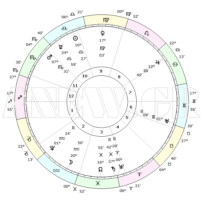 | ΘΕΣΕΙΣ ΠΛΑΝΗΤΩΝ ΑΣΤΡΟΛΟΓΙΚΟΥ ΧΑΡΤΗ ΤΗΣ ΣΤΙΓΜΗΣ ΑΥΤΗΣ | | Πλανήτης | Ζώδιο | Μοίρες | Δεκαήμ. | Σε οίκο | Απόκλιση | | Ακμές των οίκων | Ηλιος | Ζυγός | 10°22' | Δεύτερο | 11 | 04 S 06 | | 1ος | 24°22' | Σκορπιός | Σελήνη | Υδροχόος | 19°47' | Δεύτερο | 3 | 17 S 16 | | 2ος | 24°47' | Τοξότης | Ερμής | Ζυγός | 24°52' | Τρίτο | 11 | 09 S 59 | | 3ος | 29°35' | Αιγόκερως | Αφροδίτη | Παρθένος | 16°58' | Δεύτερο | 10 | 06 N 23 | | 4ος | 05°26' | Ιχθείς | Αρης | Σκορπιός | 07°28' | Πρώτο | 12 | 14 S 06 | | 5ος | 07°06' | Κριός | Δίας | Καρκίνος | 22°45' | Τρίτο | 8 | 21 N 32 | | 6ος | 02°55' | Ταύρος | Κρόνος | Ιχθείς | 27°43'R | Τρίτο | 4 | 03 S 13 | | 7ος | 24°22' | Ταύρος | Ουρανός | Δίδυμοι | 01°09'R | Πρώτο | 7 | 20 N 11 | | 8ος | 24°47' | Δίδυμοι | Ποσειδώνας | Κριός | 00°29'R | Πρώτο | 4 | 01 S 04 | | 9ος | 29°35' | Καρκίνος | Πλούτωνας | Υδροχόος | 01°24'R | Πρώτο | 3 | 23 S 32 | | 10ος | 05°26' | Παρθένος | Β. Δεσμός | Ιχθείς | 16°55' | Δεύτερο | 4 | 05 S 10 | | 11ος | 07°06' | Ζυγός | Ωροσκόπος | Σκορπιός | 24°22' | Τρίτο | | | 12ος | 02°55' | Σκορπιός | Μεσουράνημα | Παρθένος | 05°26' | Πρώτο | | | |