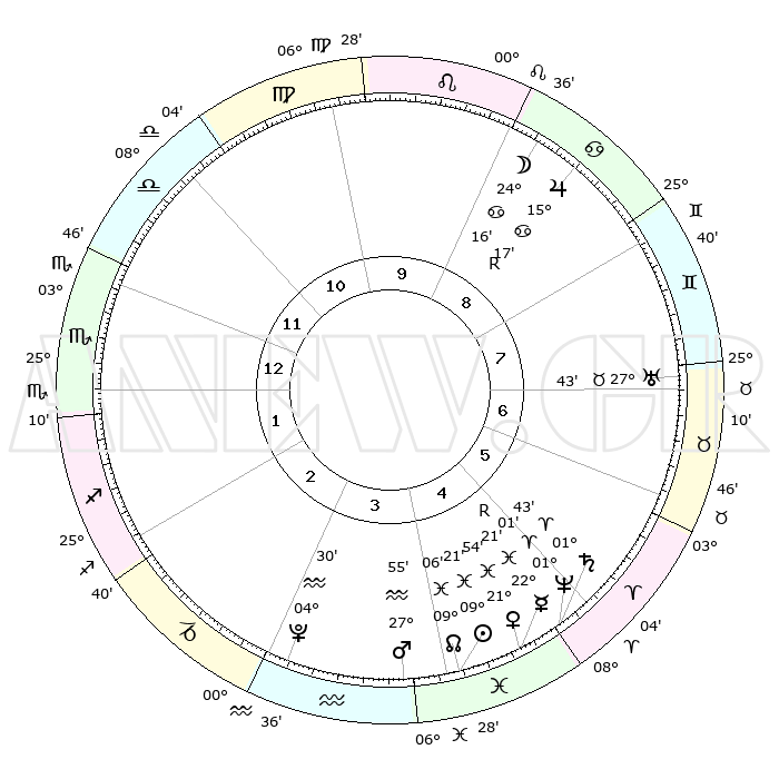 | | ΘΕΣΕΙΣ ΠΛΑΝΗΤΩΝ ΑΣΤΡΟΛΟΓΙΚΟΥ ΧΑΡΤΗ ΤΗΣ ΣΤΙΓΜΗΣ ΑΥΤΗΣ | | | | Πλανήτης | Ζώδιο | Μοίρες | Δεκαήμ. | Σε οίκο | Απόκλιση | | Ακμές των οίκων | | Ηλιος | Ιχθείς | 09°17' | Πρώτο | 4 | 08 S 05 | | 1ος | 10°41' | Σκορπιός | | Σελήνη | Καρκίνος | 23°34' | Τρίτο | 9 | 25 N 05 | | 2ος | 09°48' | Τοξότης | | Ερμής | Ιχθείς | 22°21'R | Τρίτο | 5 | 00 S 10 | | 3ος | 12°46' | Αιγόκερως | | Αφροδίτη | Ιχθείς | 21°50' | Τρίτο | 5 | 04 S 30 | | 4ος | 17°44' | Υδροχόος | | Αρης | Υδροχόος | 27°53' | Τρίτο | 4 | 13 S 14 | | 5ος | 20°23' | Ιχθείς | | Δίας | Καρκίνος | 15°17'R | Δεύτερο | 9 | 22 N 54 | | 6ος | 17°56' | Κριός | | Κρόνος | Κριός | 01°42' | Πρώτο | 5 | 01 S 17 | | 7ος | 10°41' | Ταύρος | | Ουρανός | Ταύρος | 27°43' | Τρίτο | 7 | 19 N 28 | | 8ος | 09°48' | Δίδυμοι | | Ποσειδώνας | Κριός | 01°01' | Πρώτο | 5 | 00 S 48 | | 9ος | 12°46' | Καρκίνος | | Πλούτωνας | Υδροχόος | 04°30' | Πρώτο | 3 | 22 S 53 | | 10ος | 17°44' | Λέων | | Β. Δεσμός | Ιχθείς | 09°06' | Πρώτο | 4 | 08 S 09 | | 11ος | 20°23' | Παρθένος | | Ωροσκόπος | Σκορπιός | 10°41' | Δεύτερο | | | 12ος | 17°56' | Ζυγός | | Μεσουράνημα | Λέων | 17°44' | Δεύτερο | | | |
