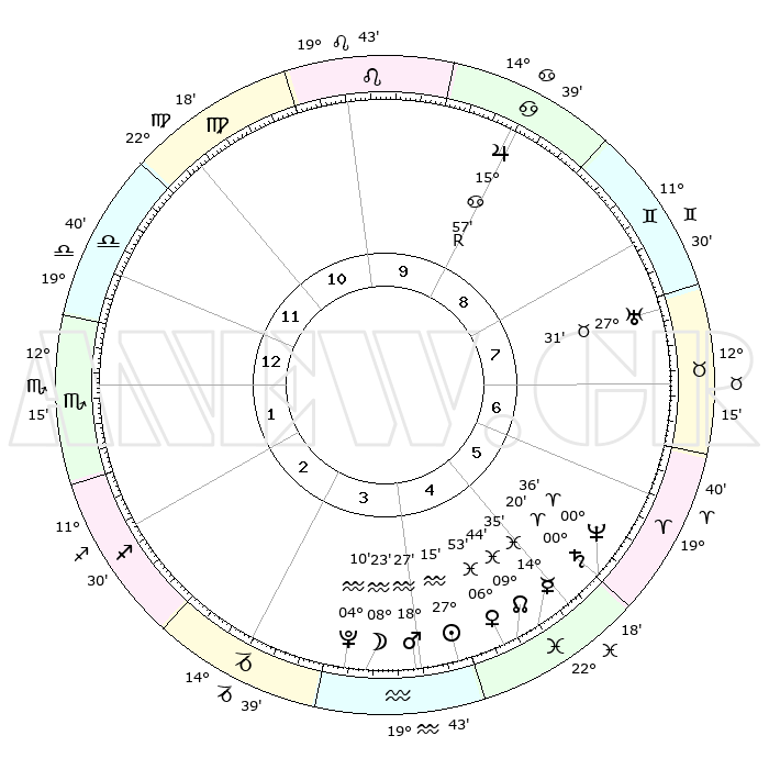 | | ΘΕΣΕΙΣ ΠΛΑΝΗΤΩΝ ΑΣΤΡΟΛΟΓΙΚΟΥ ΧΑΡΤΗ ΤΗΣ ΣΤΙΓΜΗΣ ΑΥΤΗΣ | | | | Πλανήτης | Ζώδιο | Μοίρες | Δεκαήμ. | Σε οίκο | Απόκλιση | | Ακμές των οίκων | | Ηλιος | Υδροχόος | 27°11' | Τρίτο | 4 | 12 S 27 | | 1ος | 26°07' | Ζυγός | | Σελήνη | Υδροχόος | 07°41' | Πρώτο | 4 | 21 S 00 | | 2ος | 24°18' | Σκορπιός | | Ερμής | Ιχθείς | 14°31' | Δεύτερο | 5 | 05 S 52 | | 3ος | 25°58' | Τοξότης | | Αφροδίτη | Ιχθείς | 06°49' | Πρώτο | 5 | 10 S 22 | | 4ος | 29°54' | Αιγόκερως | | Αρης | Υδροχόος | 18°25' | Δεύτερο | 4 | 16 S 20 | | 5ος | 02°51' | Ιχθείς | | Δίας | Καρκίνος | 15°58'R | Δεύτερο | 9 | 22 N 48 | | 6ος | 01°51' | Κριός | | Κρόνος | Κριός | 00°19' | Πρώτο | 5 | 01 S 51 | | 7ος | 26°07' | Κριός | | Ουρανός | Ταύρος | 27°31' | Τρίτο | 8 | 19 N 25 | | 8ος | 24°18' | Ταύρος | | Ποσειδώνας | Κριός | 00°36' | Πρώτο | 5 | 00 S 58 | | 9ος | 25°58' | Δίδυμοι | | Πλούτωνας | Υδροχόος | 04°10' | Πρώτο | 4 | 22 S 56 | | 10ος | 29°54' | Καρκίνος | | Β. Δεσμός | Ιχθείς | 09°44' | Πρώτο | 5 | 07 S 55 | | 11ος | 02°51' | Παρθένος | | Ωροσκόπος | Ζυγός | 26°07' | Τρίτο | | | 12ος | 01°51' | Ζυγός | | Μεσουράνημα | Καρκίνος | 29°54' | Τρίτο | | | |