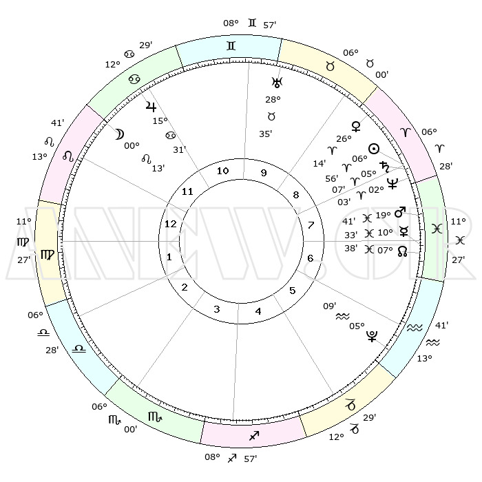 | | ΘΕΣΕΙΣ ΠΛΑΝΗΤΩΝ ΑΣΤΡΟΛΟΓΙΚΟΥ ΧΑΡΤΗ ΤΗΣ ΣΤΙΓΜΗΣ ΑΥΤΗΣ | | | | Πλανήτης | Ζώδιο | Μοίρες | Δεκαήμ. | Σε οίκο | Απόκλιση | | Ακμές των οίκων | | Ηλιος | Κριός | 06°53' | Πρώτο | 8 | 02 N 44 | | 1ος | 24°26' | Λέων | | Σελήνη | Καρκίνος | 29°25' | Τρίτο | 12 | 23 N 31 | | 2ος | 17°42' | Παρθένος | | Ερμής | Ιχθείς | 10°31' | Δεύτερο | 7 | 08 S 06 | | 3ος | 15°50' | Ζυγός | | Αφροδίτη | Κριός | 26°10' | Τρίτο | 9 | 09 N 31 | | 4ος | 18°39' | Σκορπιός | | Αρης | Ιχθείς | 19°38' | Δεύτερο | 8 | 05 S 04 | | 5ος | 23°14' | Τοξότης | | Δίας | Καρκίνος | 15°31' | Δεύτερο | 11 | 22 N 54 | | 6ος | 25°40' | Αιγόκερως | | Κρόνος | Κριός | 05°06' | Πρώτο | 8 | 00 N 05 | | 7ος | 24°26' | Υδροχόος | | Ουρανός | Ταύρος | 28°35' | Τρίτο | 10 | 19 N 40 | | 8ος | 17°42' | Ιχθείς | | Ποσειδώνας | Κριός | 02°03' | Πρώτο | 8 | 00 S 23 | | 9ος | 15°50' | Κριός | | Πλούτωνας | Υδροχόος | 05°08' | Πρώτο | 6 | 22 S 48 | | 10ος | 18°39' | Ταύρος | | Β. Δεσμός | Ιχθείς | 07°38' | Πρώτο | 7 | 08 S 42 | | 11ος | 23°14' | Δίδυμοι | | Ωροσκόπος | Λέων | 24°26' | Τρίτο | | | 12ος | 25°40' | Καρκίνος | | Μεσουράνημα | Ταύρος | 18°39' | Δεύτερο | | | |